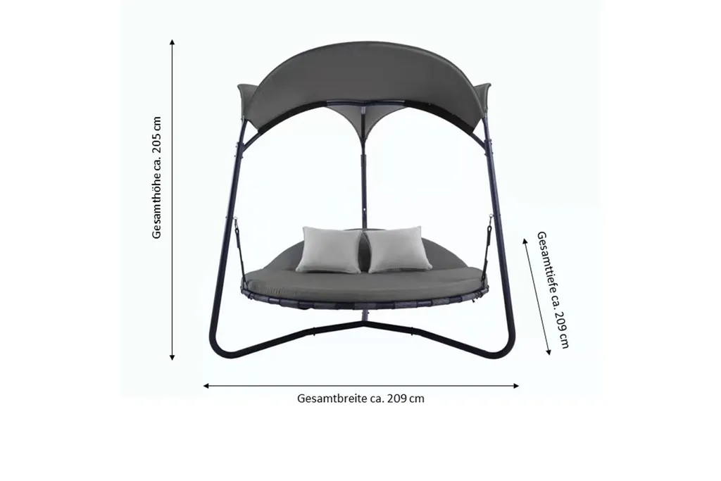 Das Gestell dieser Doppel-Sonnenliege besteht aus pulverbeschichtetem Stahl und ist damit für den Einsatz im Garten gut geeignet. Die ca. 209 x 209 cm große Liegefläche besteht aus strapazierfähigem 100% Polyestergewebeund bietet zwei Personen einen gemütlichen Liegeplatz. Belastbar ist die Liege mit bis zu ca. 220kg. Zwei gemütliche Kissen, farblich passend zur Liegefläche, sind bereits im Lieferumfang enthalten und sorgen für den maximalen Liegekomfort. Besonders praktisch ist das integrierte Sonnendach aus Kunststoffgewebe. Es ist an der Liege befestigt und lässt sich einfach abnehmen.