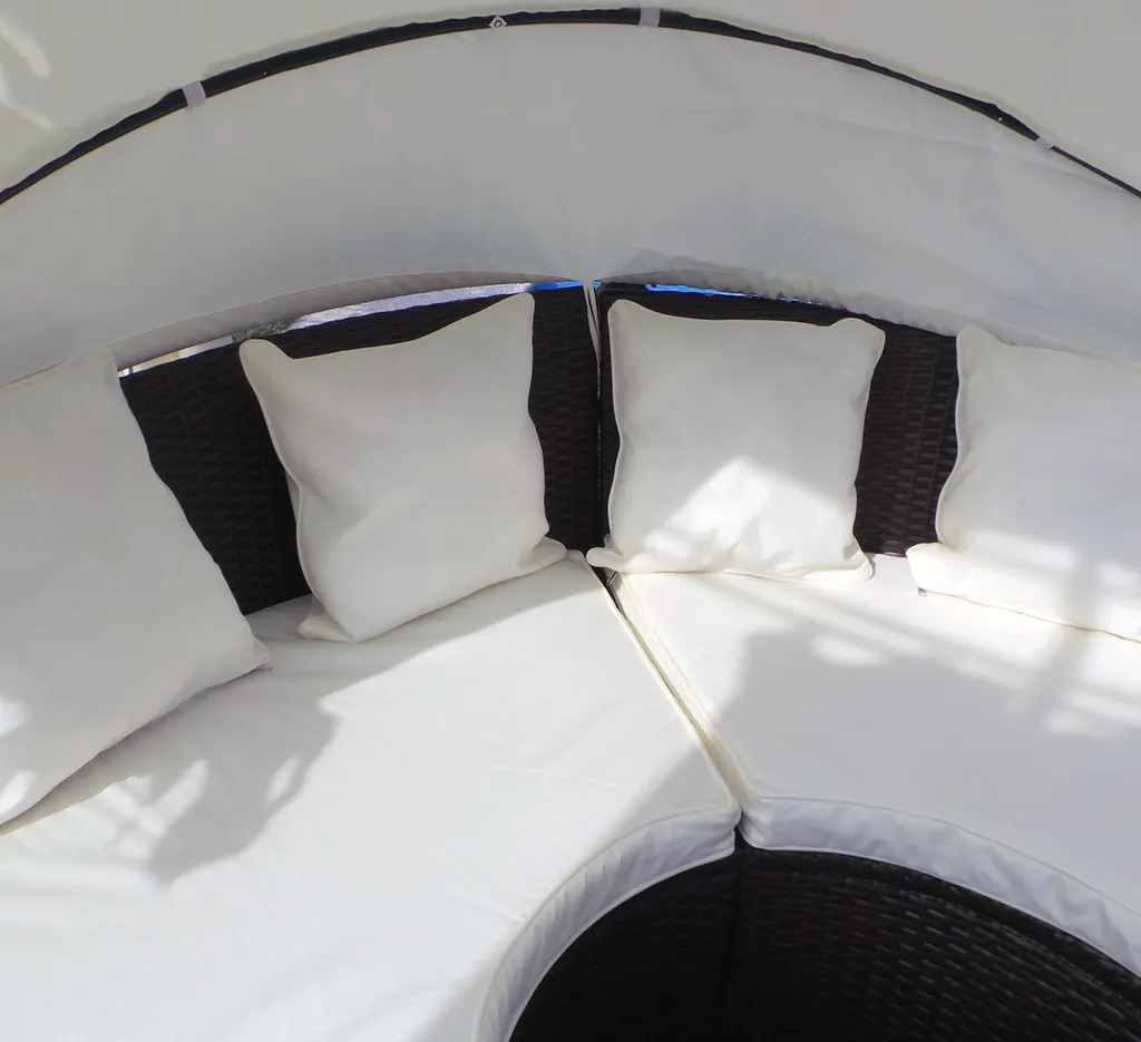 Die LED-Sonneninsel von Swing&Harmonie® kann durch die modulare Bausweise sowohl als große Liegefläche, sowie als Sitzgruppe für mehrere Personen genutzt werden. Die Polyrattanfaser wurde von Hand auf den pulverbeschichteten Rahmen geflochten. Diese ist äußerst wetterresistent, pflegeleicht und trotzt Hitze, Frost, Chlor und Salzwasser.