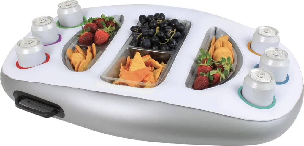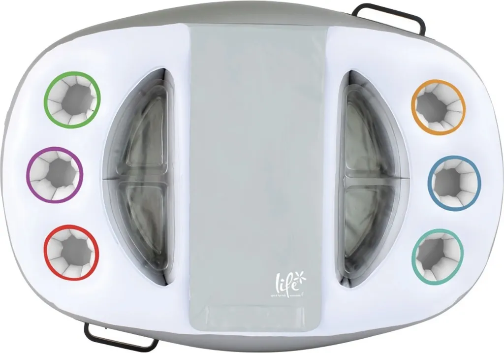 Mit diesem Spa-Gadget müssen Sie Ihr Spa nicht für etwas Leckeres oder ein Getränk verlassen! Mit mehreren Fächern für Getränke und Snacks können Sie alles in Ihrem Spa sicher verstauen. Diese Spa-Bar bietet Platz für 6 verschiedene Getränke und mehrere Fächer für Snacks oder andere Dinge. Diese Spa-Bar bietet durch ihr stabiles schwimmendes Design Sicherheit für Ihre Getränke und Snacks. Dies verhindert, dass er sich umdreht. Durch die farbigen Kanten um die Getränkehalter ist leicht zu erkennen, wer welches Getränk hat.