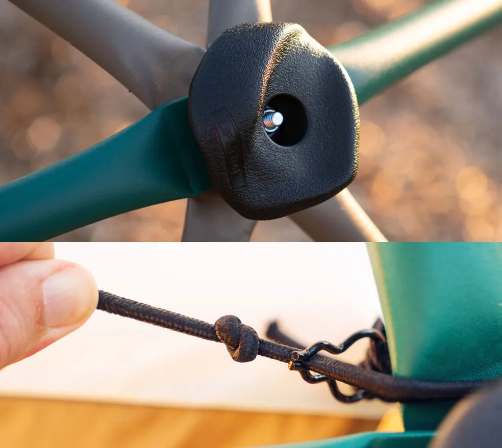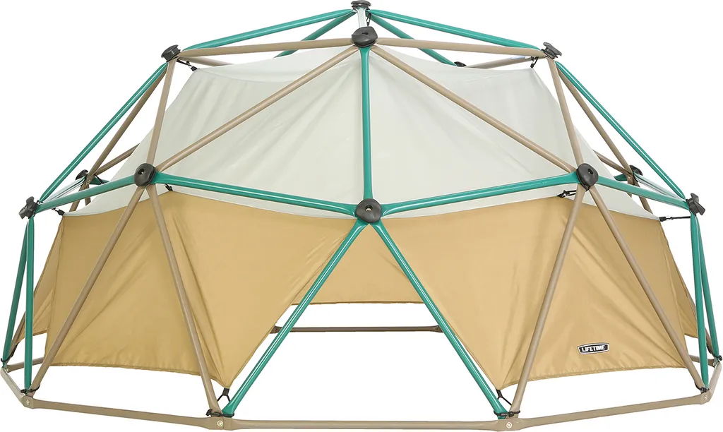 Der Rahmen aus pulverbeschichtetem, rostfreiem und witterungsbeständigem Stahl sorgt für besondere Stabilität. Eine mitgelieferte Abdeckung aus 150D Polyester sorgt für zusätzlichen Spielspaß und kann von Kindern als Zelt oder Höhle genutzt werden. Die Griffe der Verstrebungen sind aus speziellem HDPE-Kunststoff hergestellt und erleichtern besonders jüngeren Kindern das Klettern. Der Geodome Kletterturm ist freistehend und kann nach Belieben im Garten platziert werden, da kein extra Fundament geschaffen werden muss.