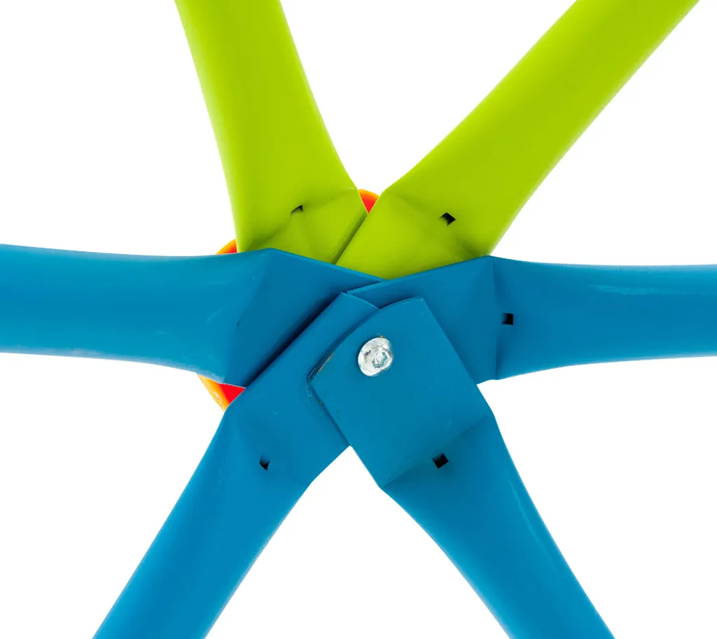 Der Rahmen aus pulverbeschichtetem, rostfreiem und witterungsbeständigem Stahl sorgt für besondere Stabilität. Die Griffe der Verstrebungen sind aus speziellem HDPE-Kunststoff (hochdichter Polyethylen) hergestellt und erleichtern besonders jüngeren Kindern das Klettern. Der Geodome Kletterturm ist freistehend und kann nach Belieben im Garten platziert werden, da kein extra Fundament geschaffen werden muss.
