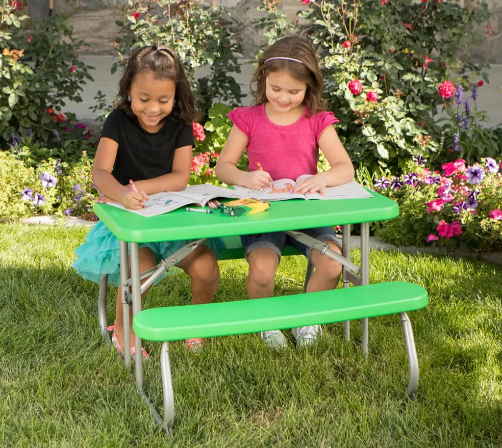 Essen, Malen, Basteln oder Spielen – Kinder im Alter von 3-8 Jahren können, mit bis zu 4 Personen, schöne Stunden auf Ihrer eigenen Sitzgarnitur verbringen. Ein hübscher kleiner Kindertisch mit passender Bank wird zu einer großartigen Kinderzone. Dein Kind wird es genießen, mit seinen Kindergartenfreunden seinen eigenen Kindertisch zu haben. Die Kleinen müssen nicht mehr auf den übergroßen Stühlen und an den Tischen der Erwachsenen platznehmen und bekommen, mit dem farbenfrohen Picknicktisch-Set, die bequeme und stilvolle Alternative.