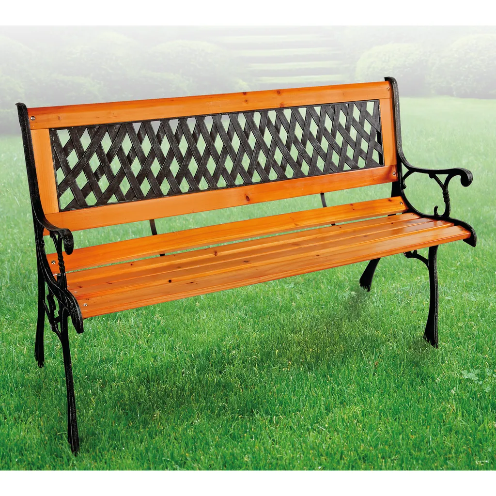 Diese dekorative Gartenbank aus Massivholz und Metall sorgt für gemütliche Stunden der Entspannung im Garten. Sie bietet für 2 Personen ausreichend Platz. Die Sitzbank wurde aus Metall und Holz gefertigt. Egal ob im Garten, auf dem Balkon, der Terrasse oder im Wintergarten, die Parkbank ist ein echter Blickfang.