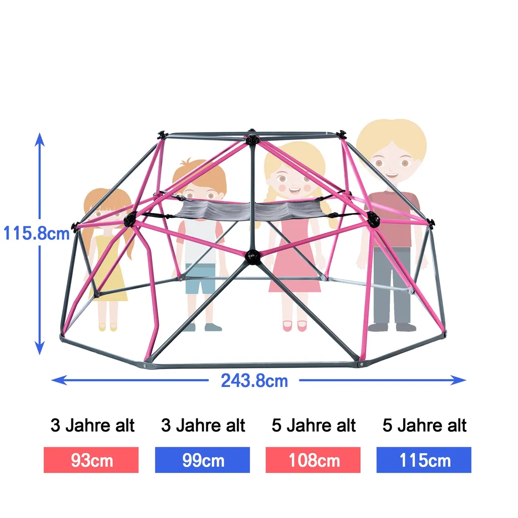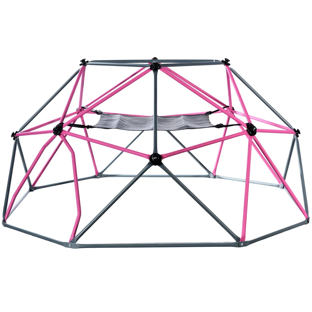 Wollen Sie Ihren Hof in einen Fantasy-Spielplatz verwandeln? Diese lebendige rosen und schwarze Kletterkuppel ist die perfekte Wahl für Ihre Kinder, um alle Teile ihres Körpers zu trainieren. Die leuchtenden Farben können für große Anziehungskraft auf Kinder sorgen. Jeder Stahlrohrdrehpunkt ist mit einer Kletterhalterung ausgestattet, auf die Kinder bequem treten können, was das Kletterinteresse der Kinder definitiv weckt.