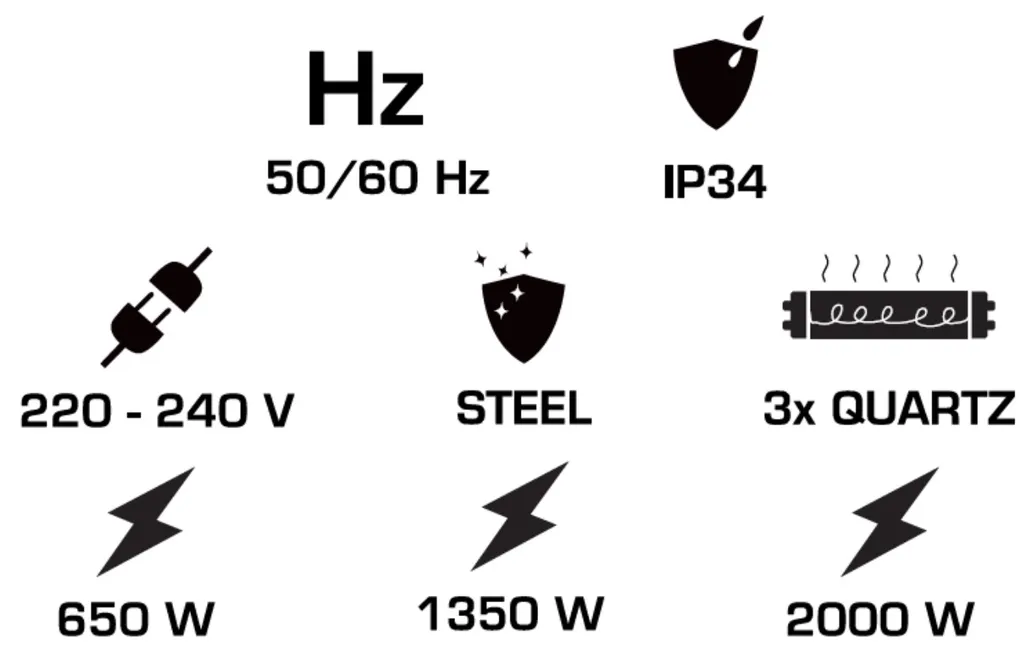 Der Wärmestrahler hat drei Heizstufen mit 650 Watt, 1300 Watt und 2000 Watt, mit dieser Leistung sorgt er schnell für eine angenehme Temperatur und wärmt effizient mit gleichmäßiger und zielgerichteter Wärmeverteilung. So können Sie stets die richtige Wärme wählen und den Heizstrahler von Anfang Herbst bis tief in den Winter benutzen.