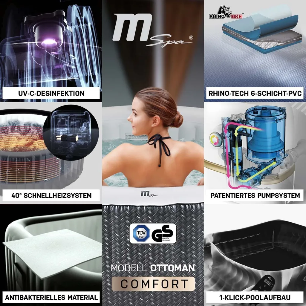 mit UV-C-Entkeimer, Filter-Erinnerung, Plug-&-Play-Aufbau, Timer & mehr. Sie genießen Ihren Garten gerade in der warmen Jahreszeit als pure Lebensqualität? Sie lieben es, in eine entspannte Auszeit einzutauchen und den Alltagsstress hinter sich zu lassen? Wo wir gerade beim Eintauchen sind: Entdecken Sie hier mit dem Miweba MSpa Whirlpool Ottoman eine wohltuende Bereicherung für den Außenbereich. Exakt temperiertes und anregend sprudelndes Wasser sorgt für eine wohltuende Spa-Atmosphäre. Und das Beste: Nutzen Sie daheim die größtmögliche Privatsphäre. Ein aufblasbarer Pool wie dieser muss nicht – wie in öffentlichen Einrichtungen üblich – mit anderen geteilt werden. Es sei denn, Sie wollen es. Denn in diesem Garten-Whirlpool können es sich auf Wunsch bis zu 6 Personen gemütlich machen.