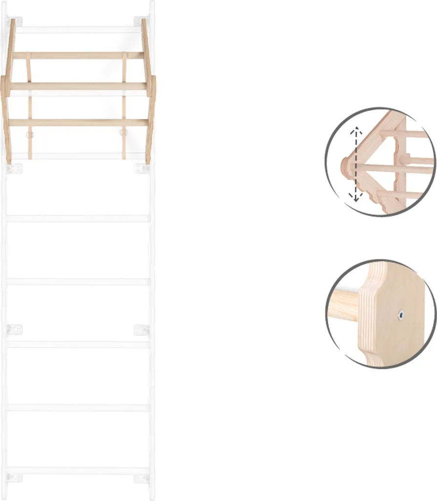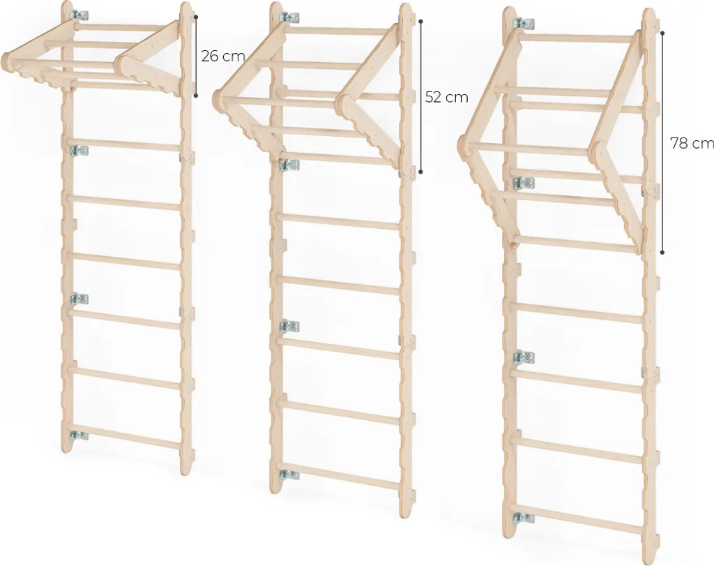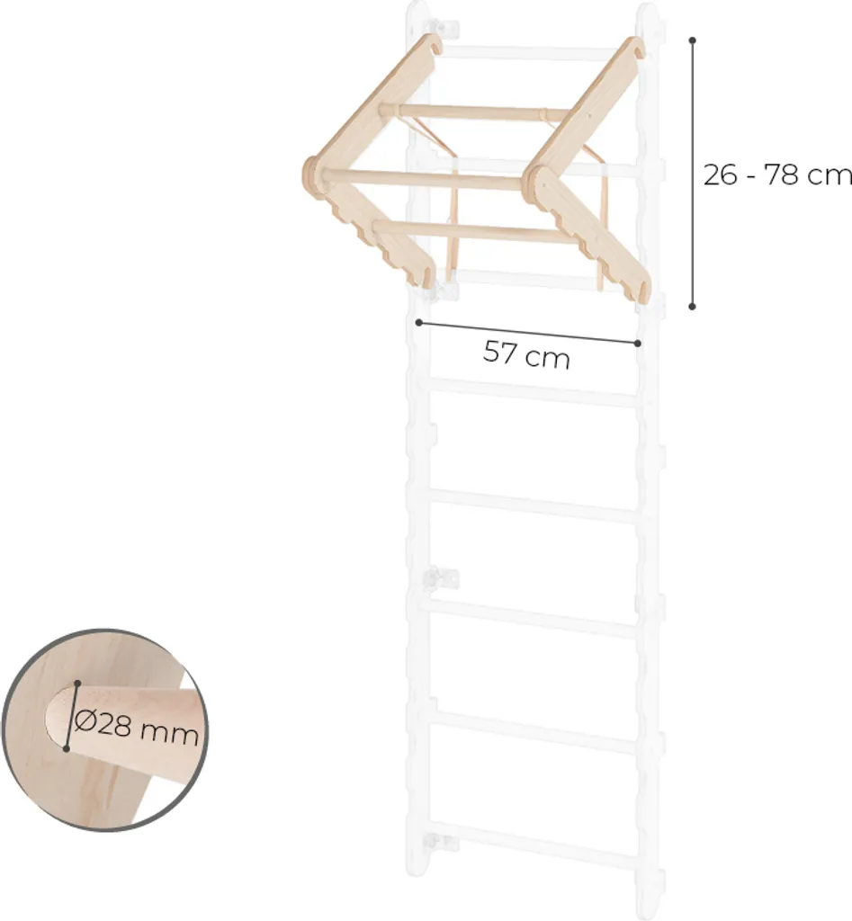 Dieses Sprossenwand Zubehör lässt sich in 3 Positionen einstellen: auf eine Länge von 26, 52 und 78 cm. So kann man das Spielzeug zwischen zwei, drei oder vier Sprossen einhängen. Dank der speziellen Öffnungen kann das Spielzeug in jeder beliebigen Höhe an der Leiter befestigt werden. Das Produkt ist für Kinder ab 36 Monaten geeignet und sollte unter Aufsicht eines Elternteils verwendet werden.
