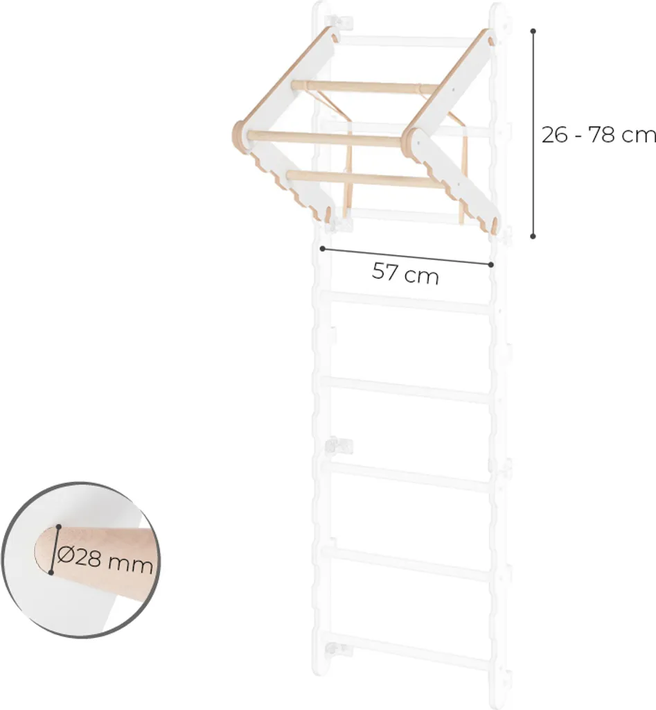 Dieses Sprossenwand Zubehör lässt sich in 3 Positionen einstellen: auf eine Länge von 26, 52 und 78 cm. So kann man das Spielzeug zwischen zwei, drei oder vier Sprossen einhängen. Dank der speziellen Öffnungen kann das Spielzeug in jeder beliebigen Höhe an der Leiter befestigt werden. Das Produkt ist für Kinder ab 36 Monaten geeignet und sollte unter Aufsicht eines Elternteils verwendet werden.