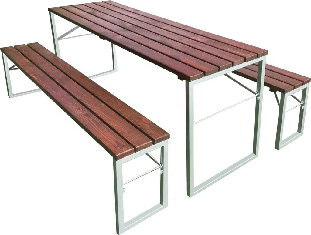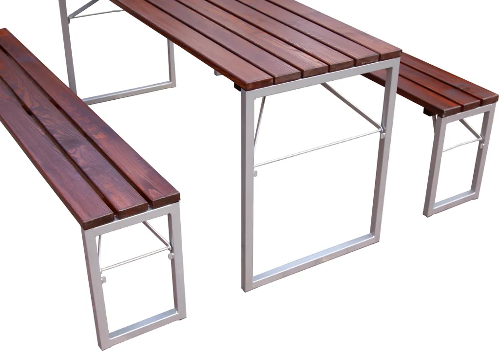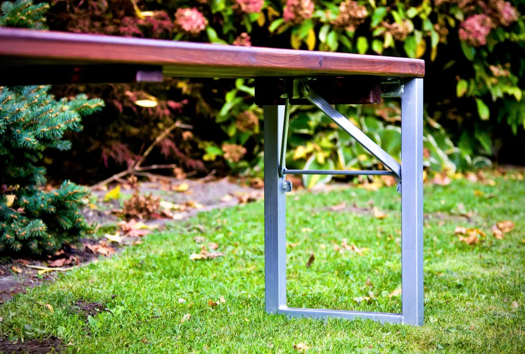 Die Tischplatten bestehen aus einzelnen Leisten, die nicht nur praktisch und ästhetisch, sondern auch witterungsbeständig sind.