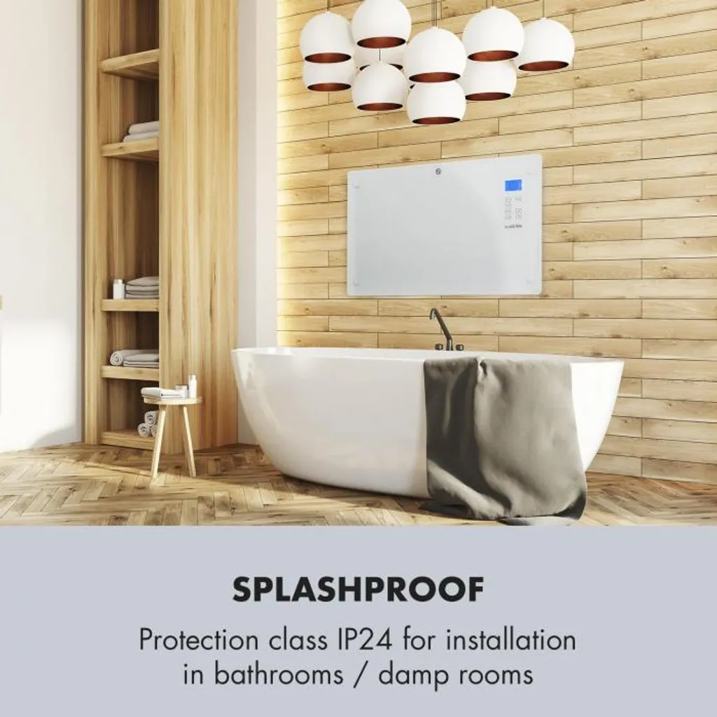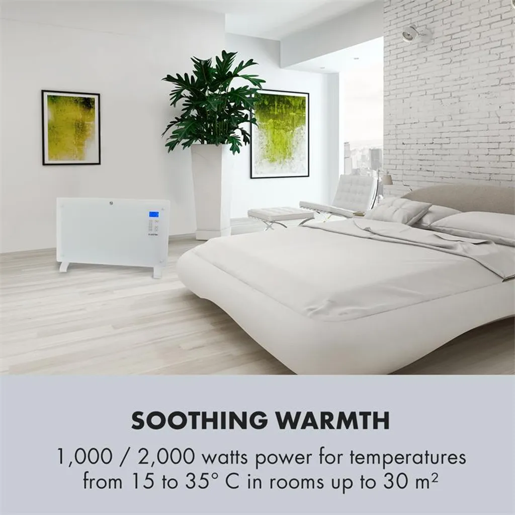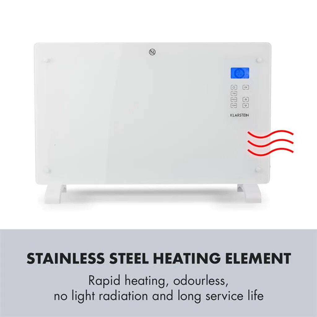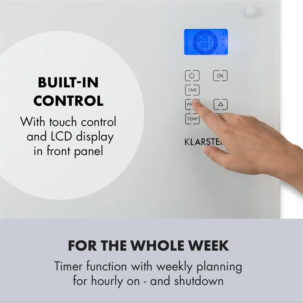 Wohltuende Wärme: 1.000 / 2.000 W Leistung für Temperaturen von 15 bis 35 °C in Räumen bis 30 m², Edelstahl-Heizelement: schnelle Erwärmung, geruchslos, keine Lichtstrahlung und hohe Lebensdauer, Integrierte Steuerung: mit Touch-Steuerung und LCD-Display in Frontpanel, Intelligentes Thermostat: mit Temperaturfühler, Überhitzungsschutz, Frost-Detektor und Sensor für offene Fenster, Flexible Aufstellung: geeignet zur Wandmontage oder als Standgerät inklusive Füßen und Montagematerial, 5 mm dickes, weiß glänzendes Glaspanel, Für die ganze Woche: Timer-Funktion mit Wochenplanung für stundengenaue An- und Abschaltung, Spritzwassergeschützt: Schutzklasse IP24 für die Aufstellung im Badezimmer/Feuchtraum