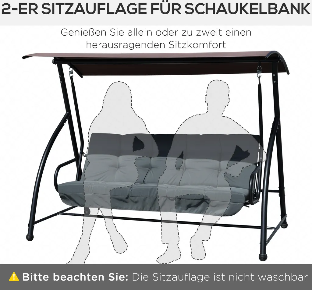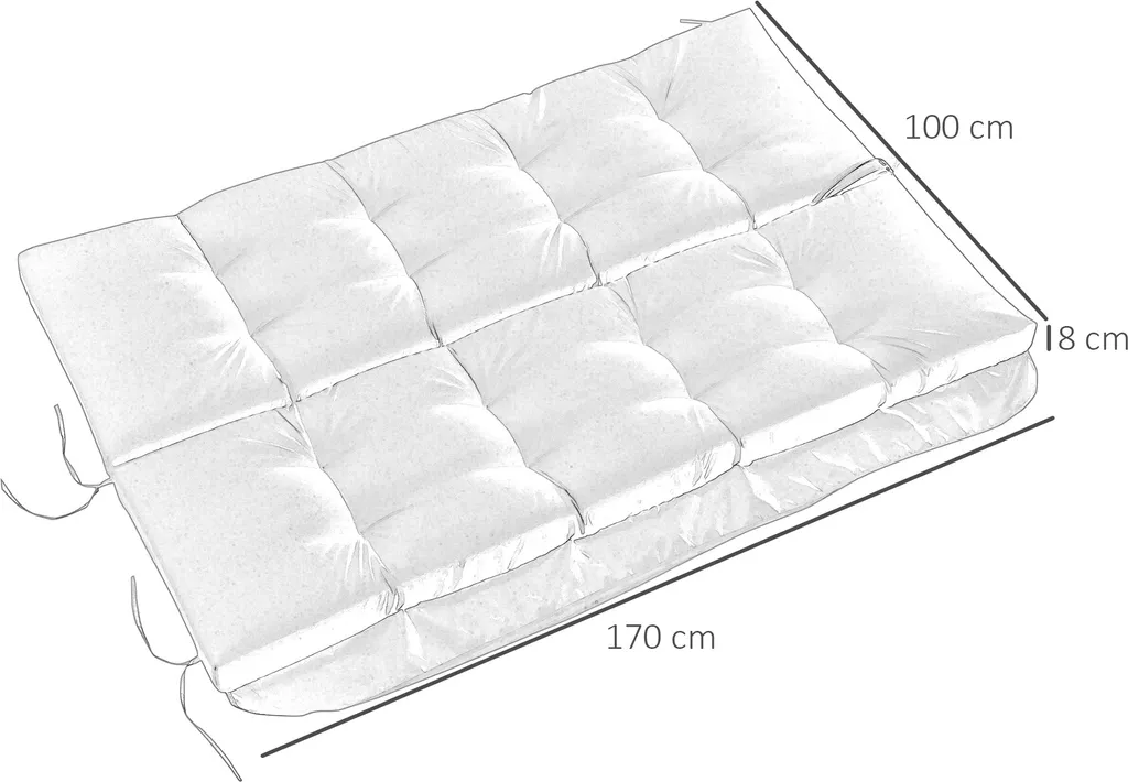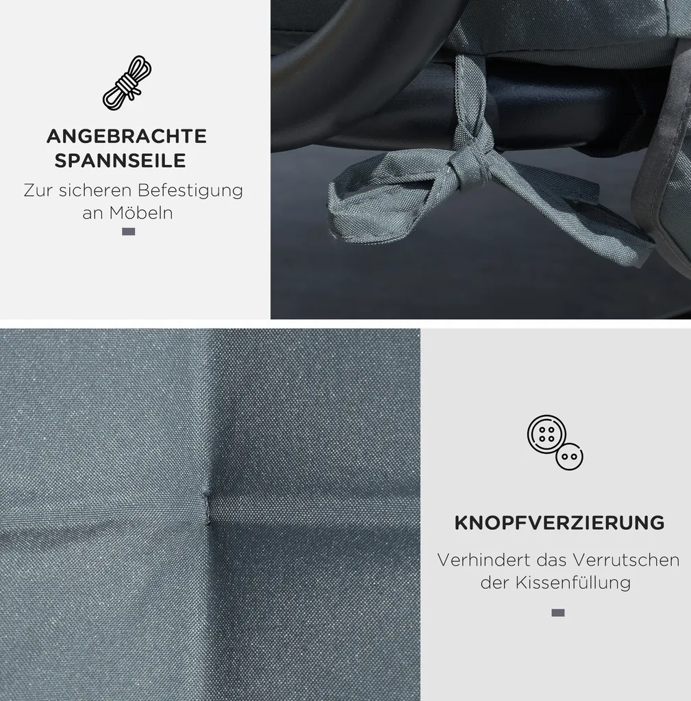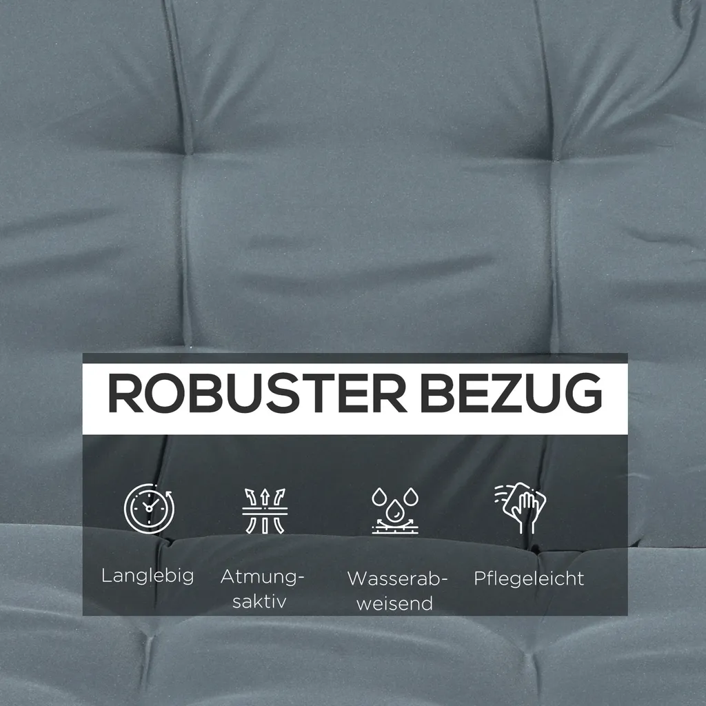 Dieses Sitzkissen von Outsunny ist ein großartiges Zubehör für ihre Schaukelbank. Es bietet zusätzlichen Komfort. Das Obermaterial ist wasserfest und atmungsaktiv. Das Stuhlkissen ist sehr leicht zu reinigen und zu pflegen. Eine weiche Füllung bietet viel zusätzlichen Komfort. Das Kissen ist so konzipiert, dass Sie es sicher an Ihren Außenmöbeln befestigen können, um ein Verrutschen zu vermeiden. Das Tufting verleiht dem Sitzkissen einen einzigartigen Look und verschönert jede Gartenschaukel.