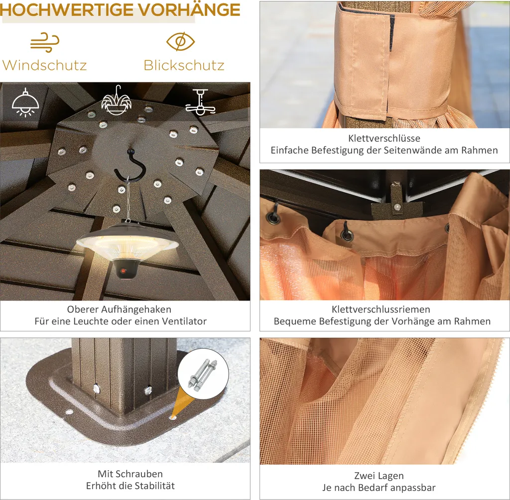 Dieser Pavillon von Outsunny bietet eine beeindruckende Kombination von Eleganz und Funktionalität. Das kunstvoll gearbeitete pyramidenförmige Dach bietet langlebigen und zuverlässigen Schutz bei jedem Wetter. Je nach Bedarf haben Sie die Wahl zwischen Moskitonetz und wasserabweisenden Seitenteilen, wodurch sie immer die perfekte Balance zwischen Innen und Außen kreieren können. Das Gestell aus pulverbeschichtetem Aluminium sorgt zusammen mit den Erdnägeln für optimale Standsicherheit.