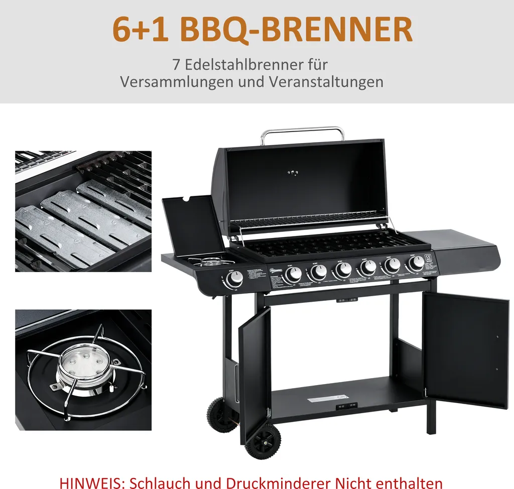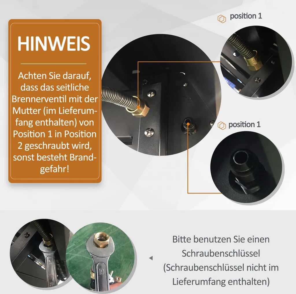 – HINWEISE: Regler und Schlauch sind NICHT im Lieferumfang des BBQ-Grills enthalten. Kompatibel mit: 37mbar Propangas, 50mbar Propangas, 28mbar Butan, 28mbar Butan, 30mbar LPG.