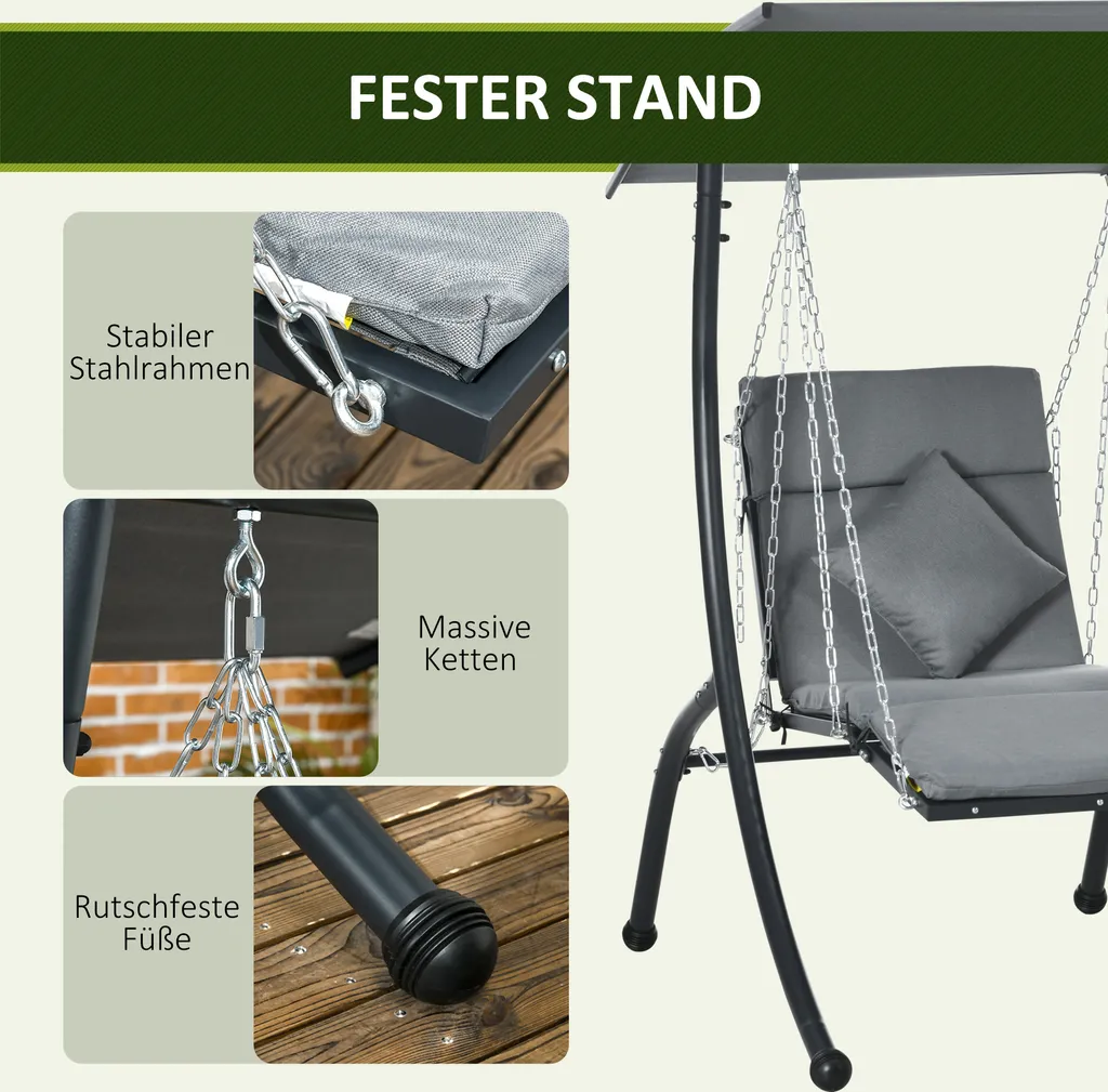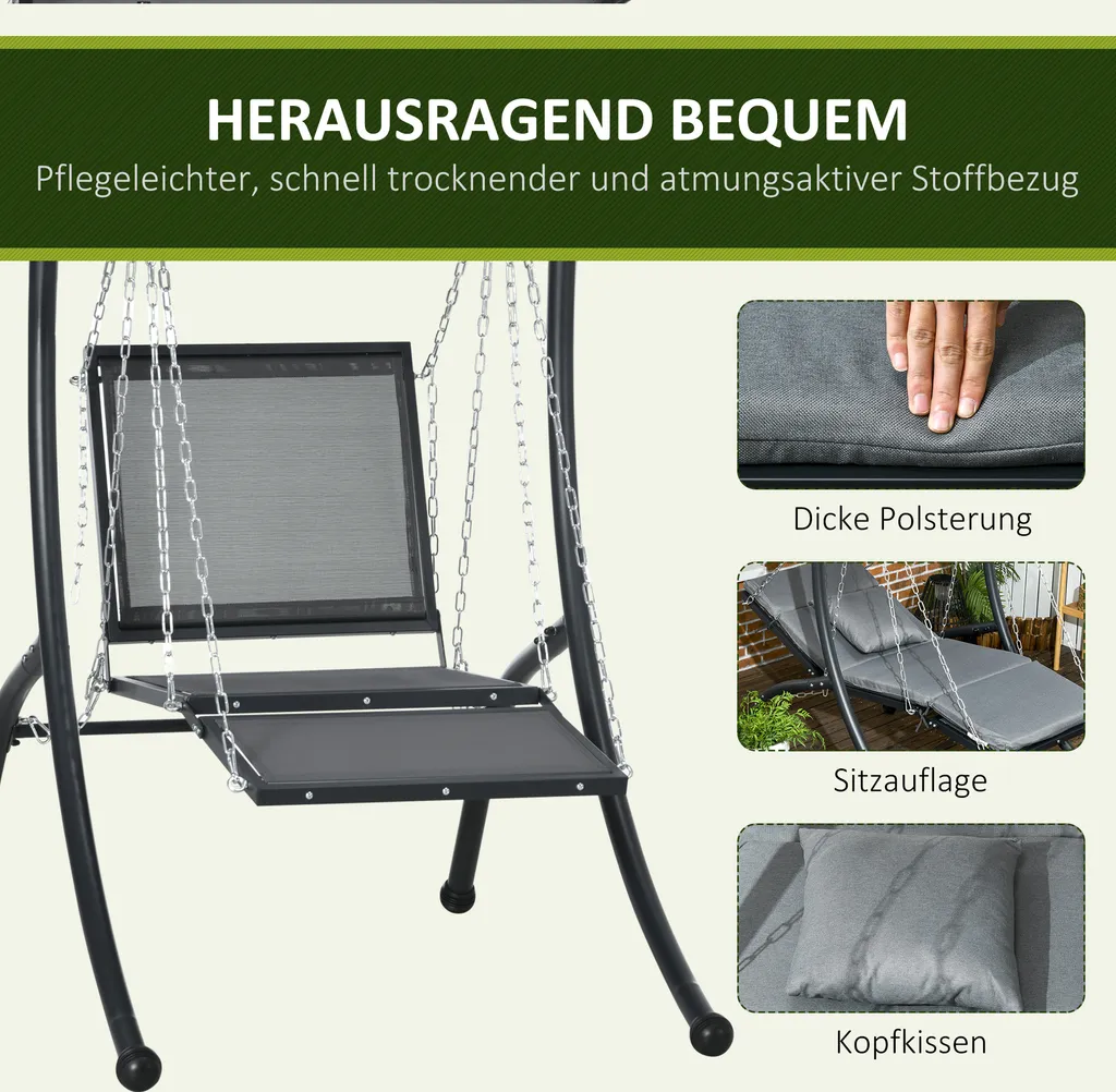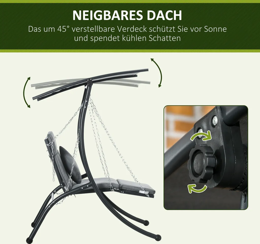 Möchten Sie Ihre Veranda oder Terrasse mit komfortablen Möbeln ausstatten? Mit Outsunny liegen Sie goldrichtig! Der besonders bequeme Sitz lässt sich aufklappen und verwandelt sich so in eine komfortable Liege. Im Lieferumfang befindet sich zudem eine weiche Sitzauflage und ein bequemes Kopfkissen, das den Nackenbereich angenehm stützt. Die Neigung des Schaukeldachs lässt sich verstellen, um den Schattenbereich an den Sonnenstand anzupassen und unangenehmes Blenden zu vermeiden.