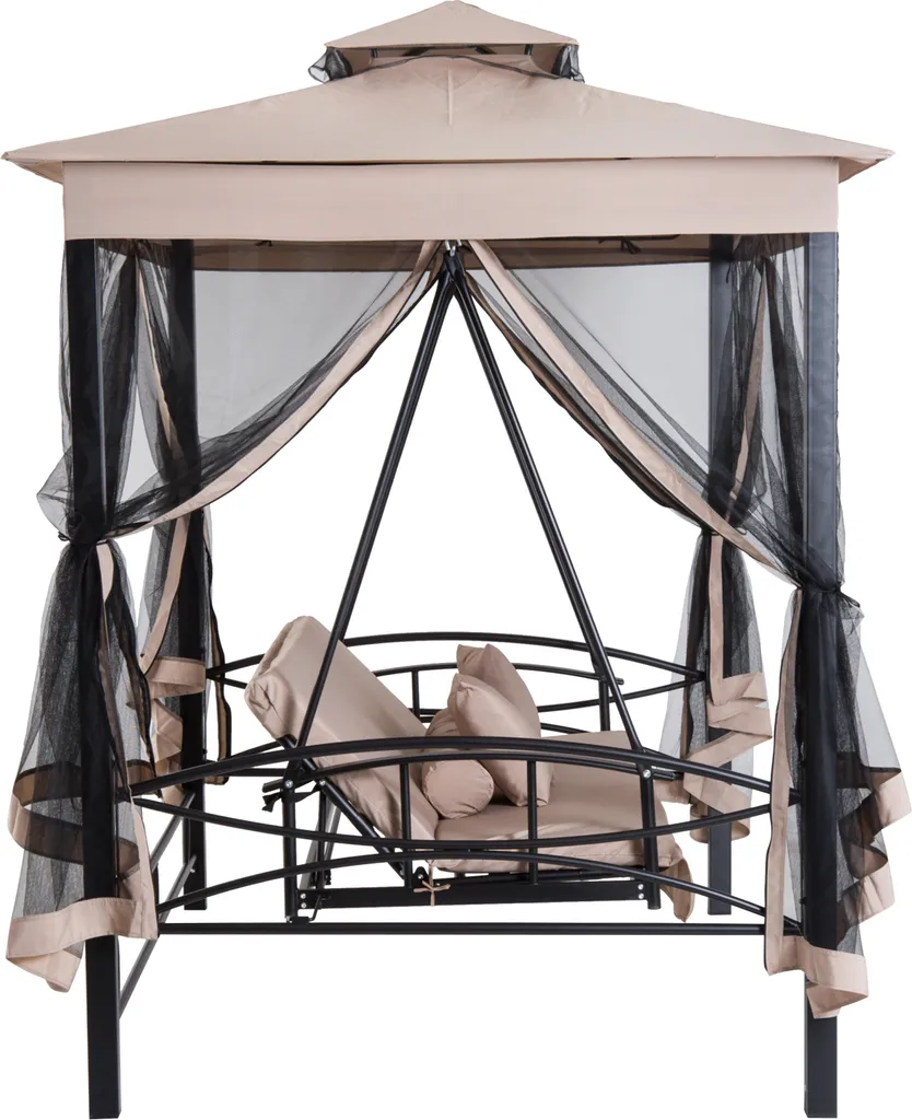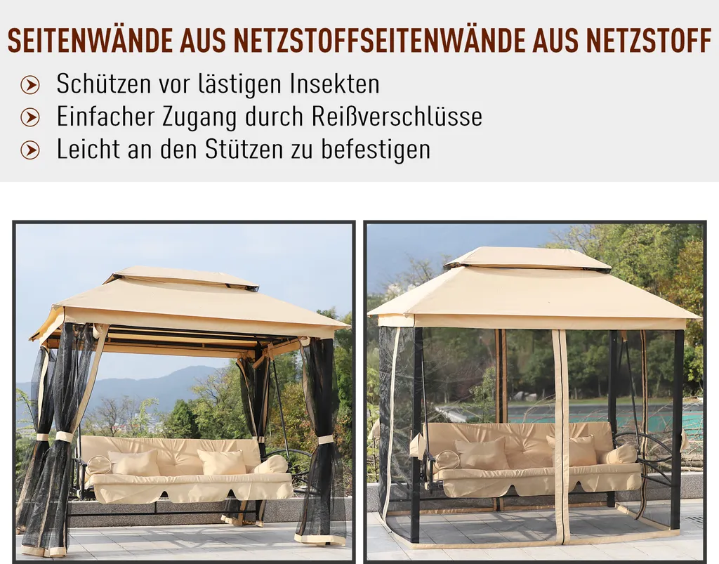 Holen Sie sich den Traum von 1001 Nacht nach Hause. Bequem sitzen Sie auf der komfortablen Sitzbank. Die Rückbank lässt sich mit wenigen Handgriffen umklappen, sodass die Liegefläche zu einem entspannten Schläfchen geradezu einlädt. Sonnendach und Bezüge sind dabei aus wasserabweisendem Polyester gefertigt. Getragen wird Ihr Ihre Gartenschaukel durch ein wertiges Gestell aus pulverbeschichtetem Metall. Und dank der umlaufenden Seitenwänden aus Moskitonetz müssen Störenfriede draußen bleiben. Genießen Sie Ihren Sommer in vollen Zügen. Mit Ihrem Traum in Beige.