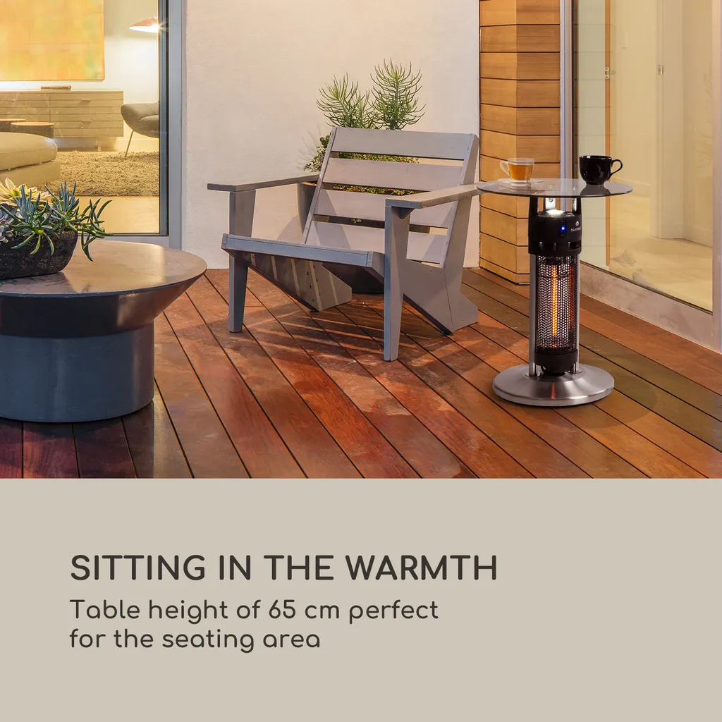 Angenehm wie die Sonne: IR Comfort Heat wärmt dich und deine Gäste auch an kühlen Tagen mit gesunden Infrarotstrahlen, Schnelle Wärme: Heiztisch mit 1200-Watt-Karbon-Infrarotheizröhre, Infrarot-Sensoren: 3 Sensoren mit ca. 60 cm Reichweite für automatische Einschaltung der Heizung bei Annäherung, Bei Wind & Wetter: im Freien verwendbar durch Spritzwasserschutz (IP44), Alles im Blick: mit zuschaltbarer, weißer LED-Beleuchtung, Robust: elegante, 50 cm Glasplatte aus getöntem 8-mm-Sicherheitsglas, Im Warmen sitzen: Tischhöhe von 65 cm perfekt für die Sitzgruppe
