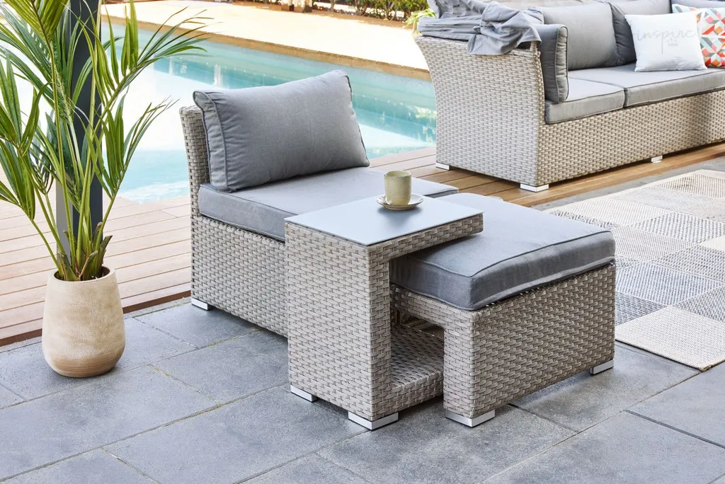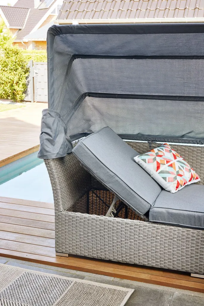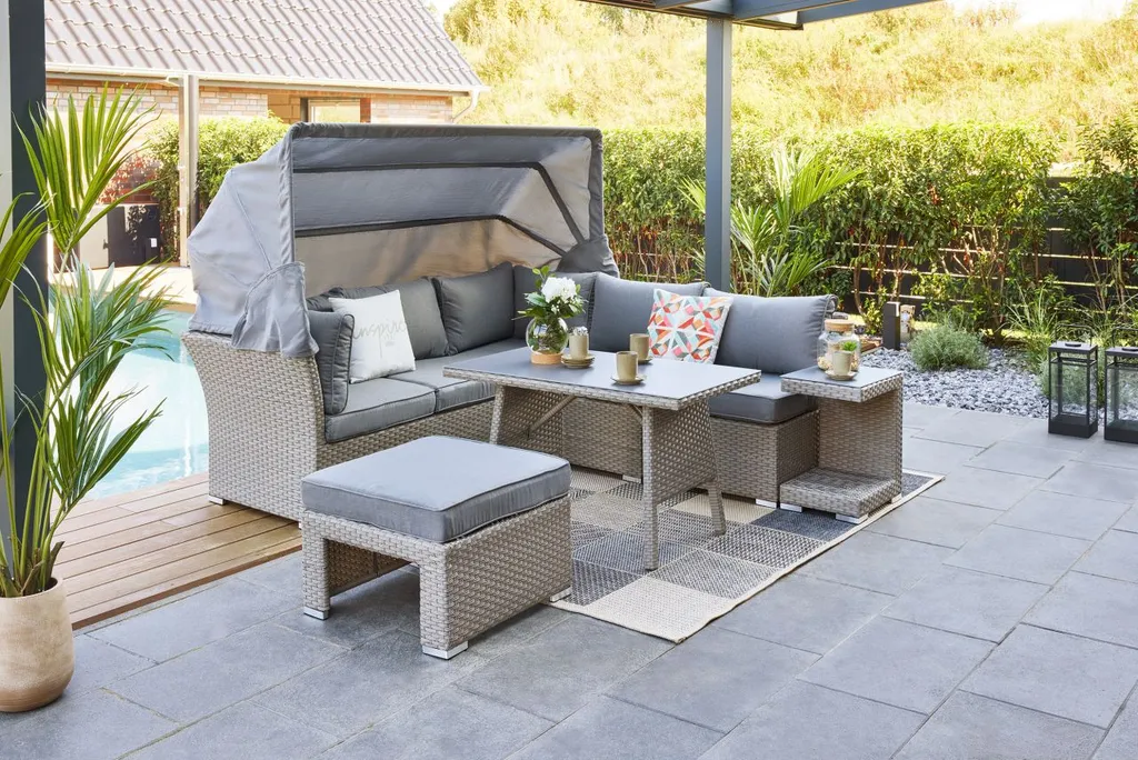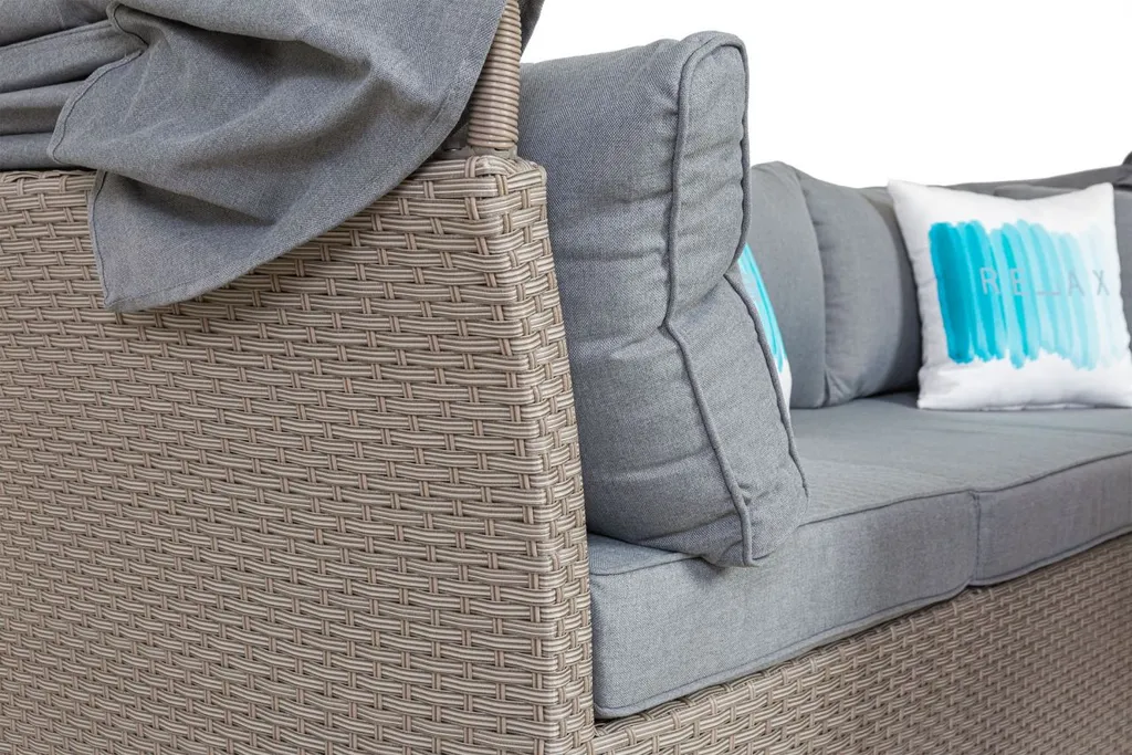 Primaster Dining Lounge Möbelset Torreon Relax inkl. Sitz- und Rückenkissen. Das Set in der Farbe Combi Grey überzeugt nicht nur optisch, sondern begeistert auch durch Witterungsbeständigkeit und Robustheit. So ist das Lounge Sofa aus einem Aluminium-Rahmen gefertigt und wird von einem Kunststoff-Geflecht umrandet. Während das Innenmaterial der Sitzkissen aus Polyurethan und Polyester besteht, ist die Außenhülle der Kissen aus 100 % Polyester gefertigt. Auch die Rückenkissen bestehen zu 100 % aus witterungsbeständigem Polyester, ebenso wie der praktische Schattenspender, der sich individuell verstellen lässt. Ein Esstisch und ein Beistelltisch machen dieses Set multifunktionell. Wer das heimische Wohn- und Esszimmer im Sommer ins Freie verlagern möchte, ist mit dem Primaster Lounge Set bestens beraten. Achten Sie im Winter auf einen trockenen