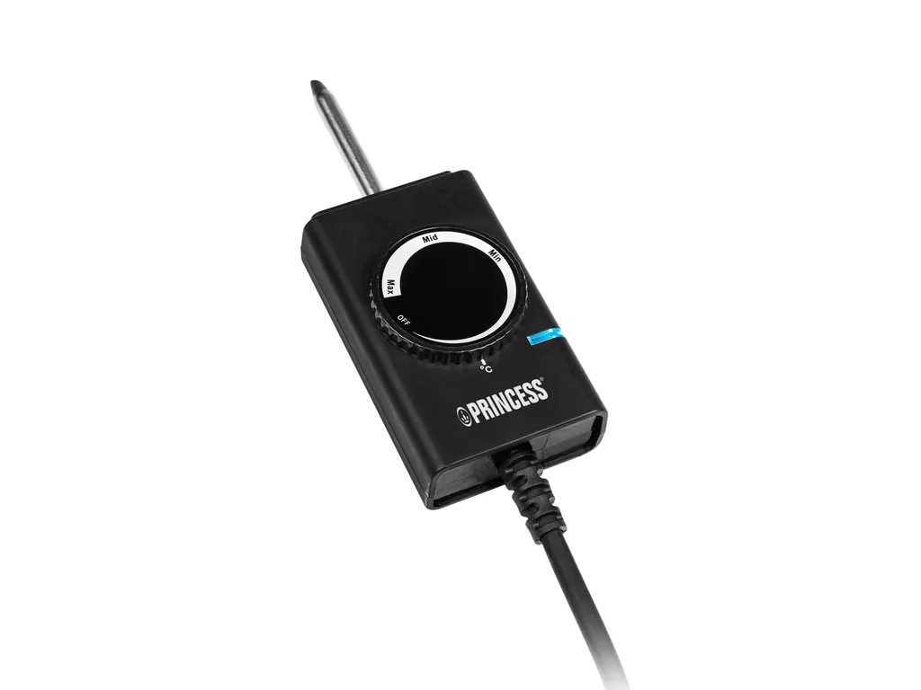 Princess Table Chef Pure Black hat ein integriertes Thermostat mit mehreren Einstellungen sowie ein abnehmbares, 2 Meter langes Kabel. Dank der hohen Leistung von 2200 Watt können Sie Fleisch, Fisch oder Gemüse schnell garen, damit der Geschmack erhalten bleibt.