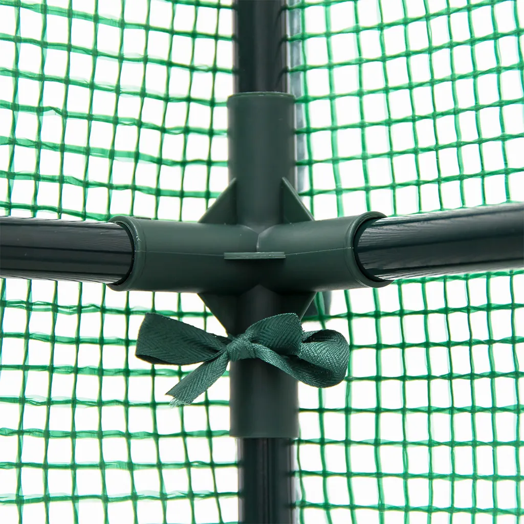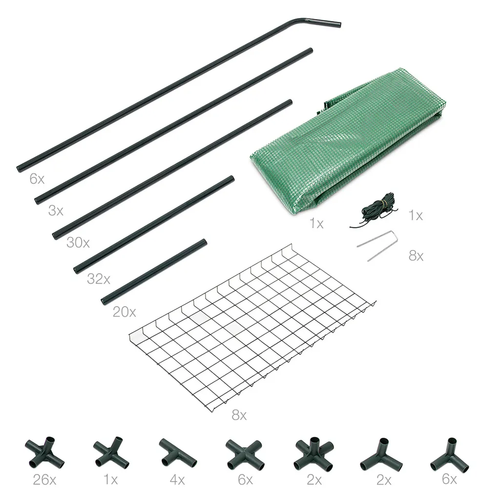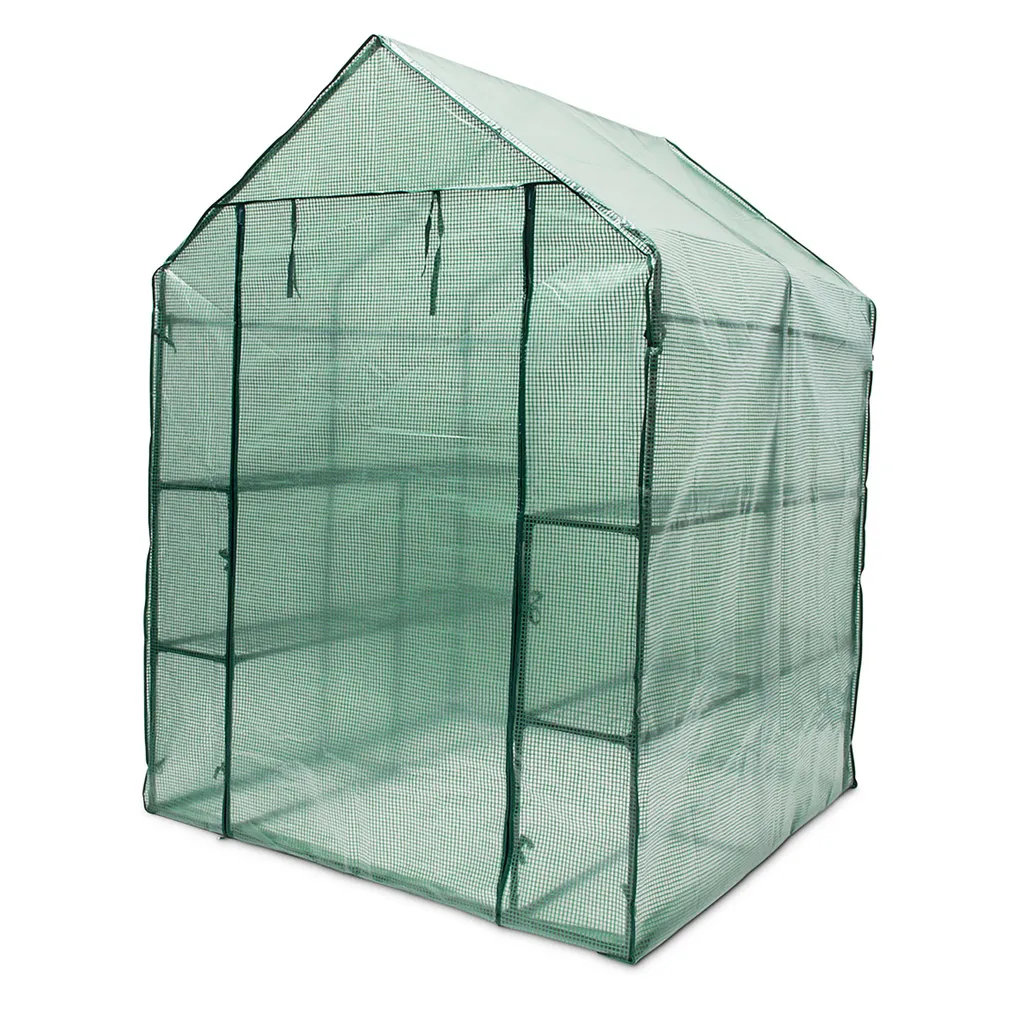 Mit dem Foliengewächshaus genießen Sie von Frühling bis Herbst frisches Obst und Gemüse. Das begehbare Treibhaus wird mittels Stecksystem ohne Werkzeug aufgebaut. Das Stahlrohrgerüst wird anschließend mit einer grünen PE-Gitterfolie abgedeckt. Sichern Sie das witterungsbeständige Anzuchthaus zusätzlich mit den mitgelieferten Heringen und Schnur. Im Inneren bieten 8 Ablagen auf 2 Ebenen viel Platz für kleine Pflanzen. Ohne Regale kann das Folienzelt auch als Tomatengewächshaus genutzt werden.