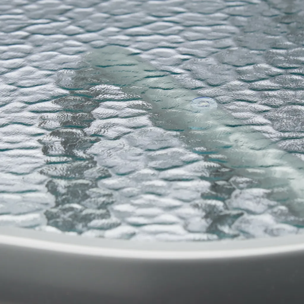 Die transparente Glasplatte des Gartentischs STRUK erinnert an die Wasseroberfläche eines Sees. Das Ornamentglas mit dem geschwungenen Stahlgestell in Anthrazit schaffen kombiniert eine ansprechende Optik. Ob im Garten, auf der Terrasse oder in der Küche – das moderne Design fügt sich hervorragend ein.