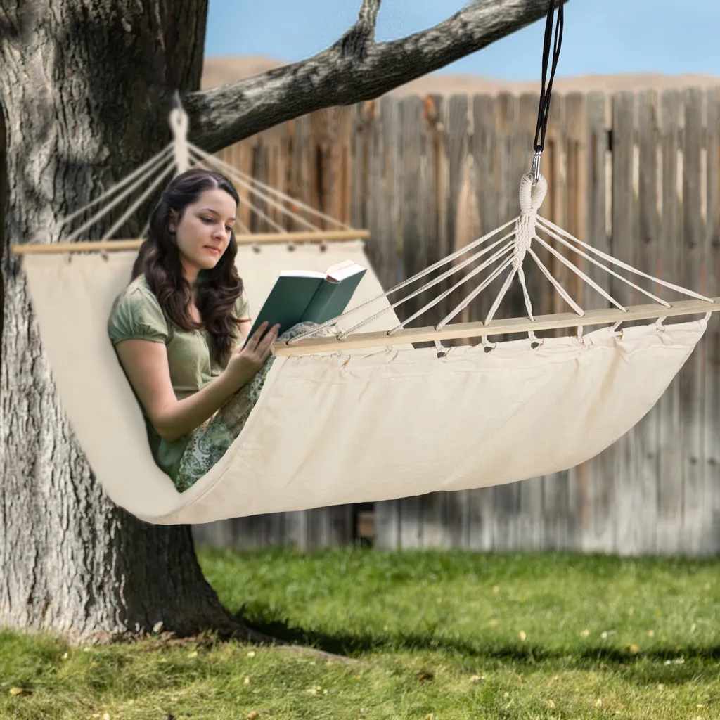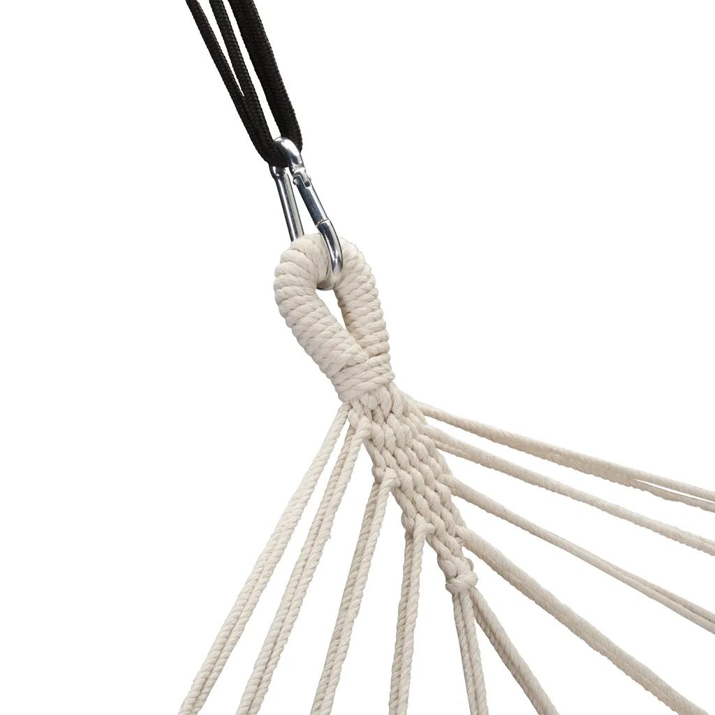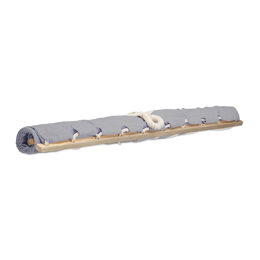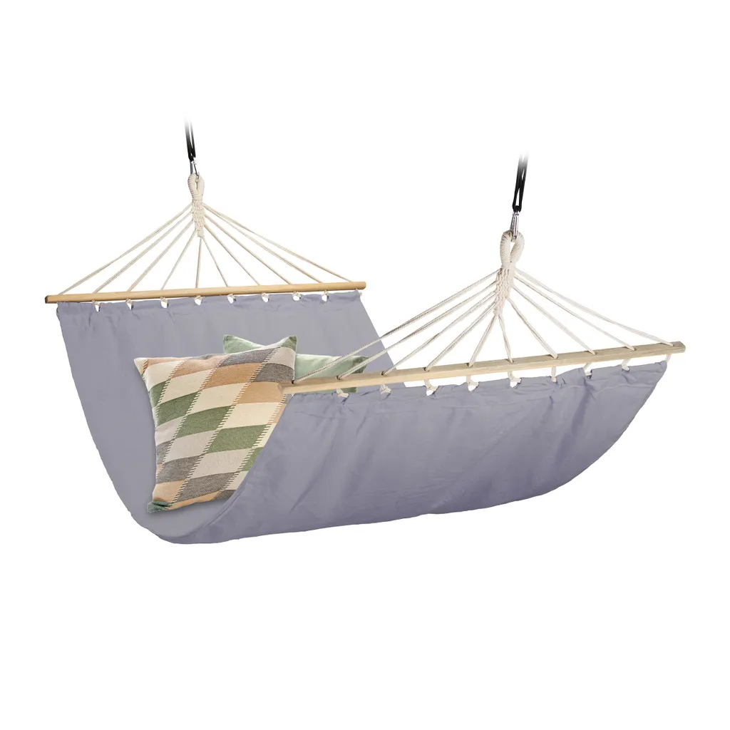 Auf dieser gemütlichen Hängematte bekommst Du Entspannung pur in der grünen Natur. Ob beim Schmökern in Deinem Lieblingsbuch im Garten oder beim Zelten mit Freunden – die Stabhängematte aus Baumwolle lädt zum Relaxen ein. Mit dem beiliegenden Befestigungsmaterial lässt sie sich einfach an einem Baum oder Gestell anbringen. Gerollt kannst Du die Outdoor Hängematte kompakt verstauen oder unterm Arm einfach in den Park oder zur Gartenparty mitnehmen. Das ideale Accessoire für Deinen Sommer.