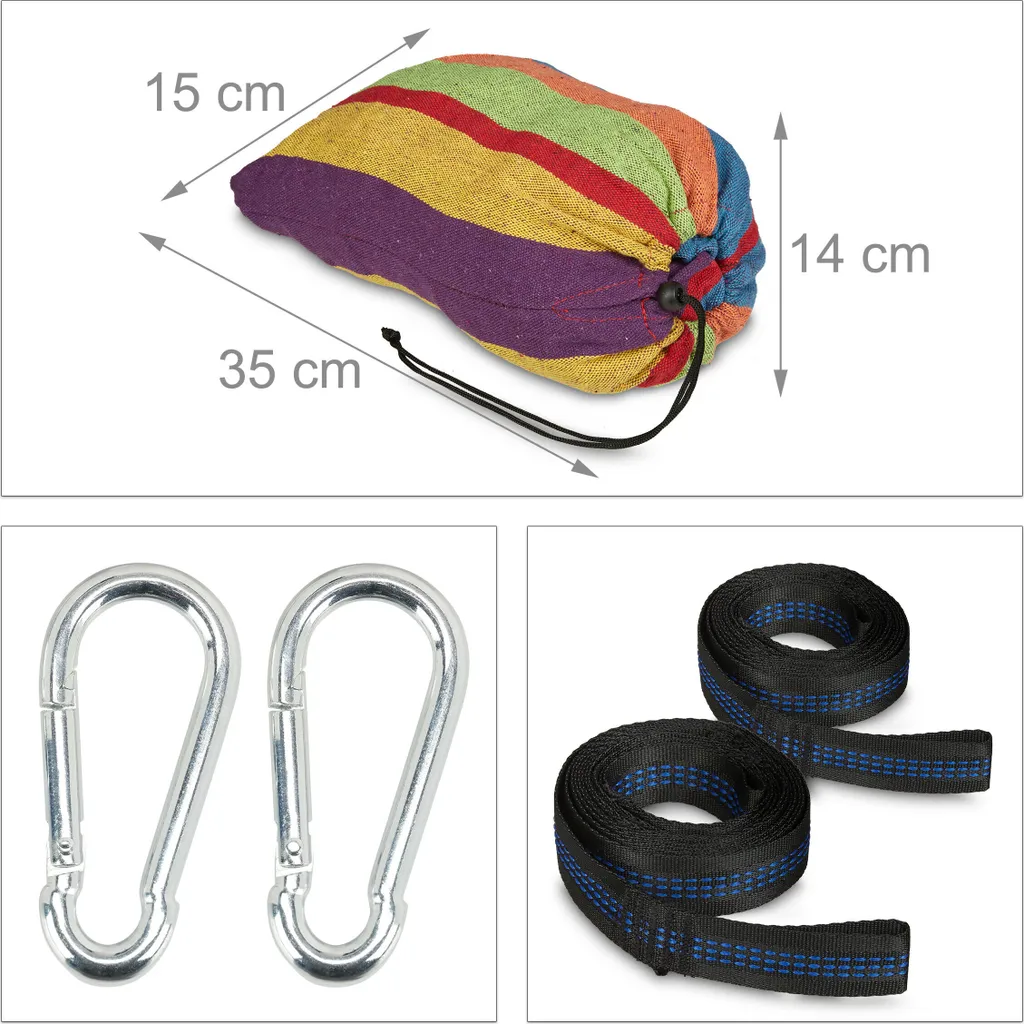 Diese Hängematte ist das ideale Accessoire für wärmere Jahreszeiten. Ob beim Schmökern in Ihrem Lieblingsroman im Garten oder beim abenteuerlichen Campingausflug mit Ihren Freunden – die Hängeliege aus Baumwolle begleitet Sie überall hin. Dank des Sacks können Sie die Outdoor Hängematte kompakt verstauen, um sie zu transportieren oder platzsparend weg zu räumen. Auch im Wohnzimmer kann die Doppelhängematte platziert werden. Dort wirkt sie dekorativ und verbreitet ein Gefühl von Gemütlichkeit.