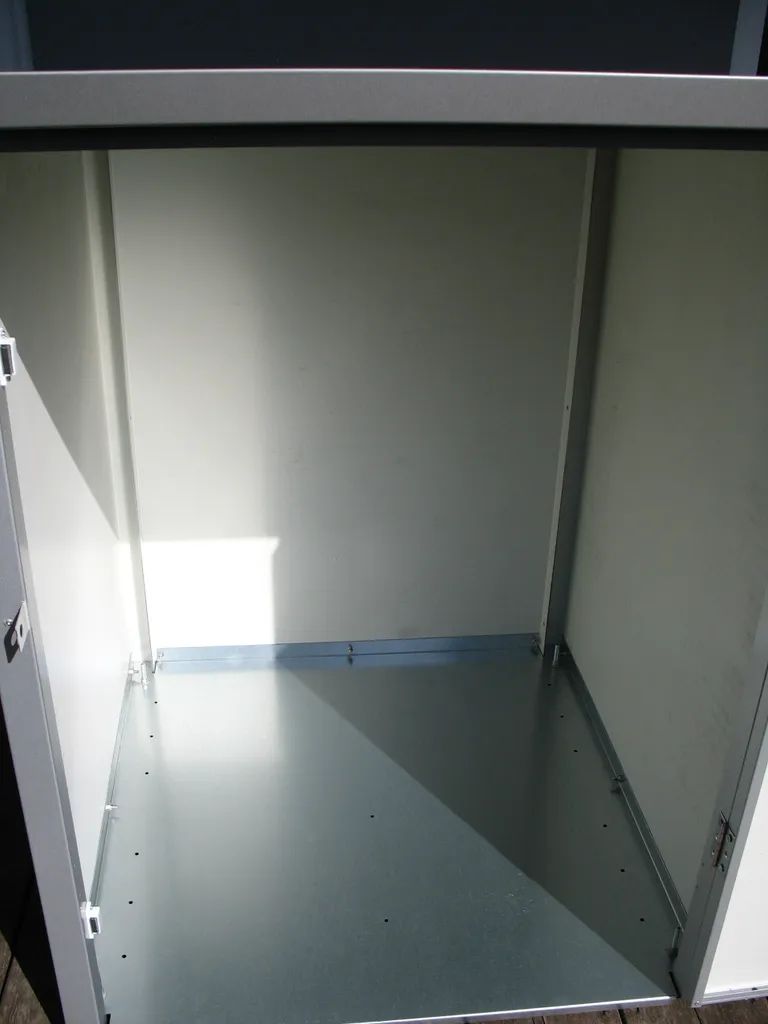 - Die Rollatorbox / Rollatorgarage besitzt einen feuerverzinkten Boden, der durch seine speziellen Kantungen enorm stabil ist.