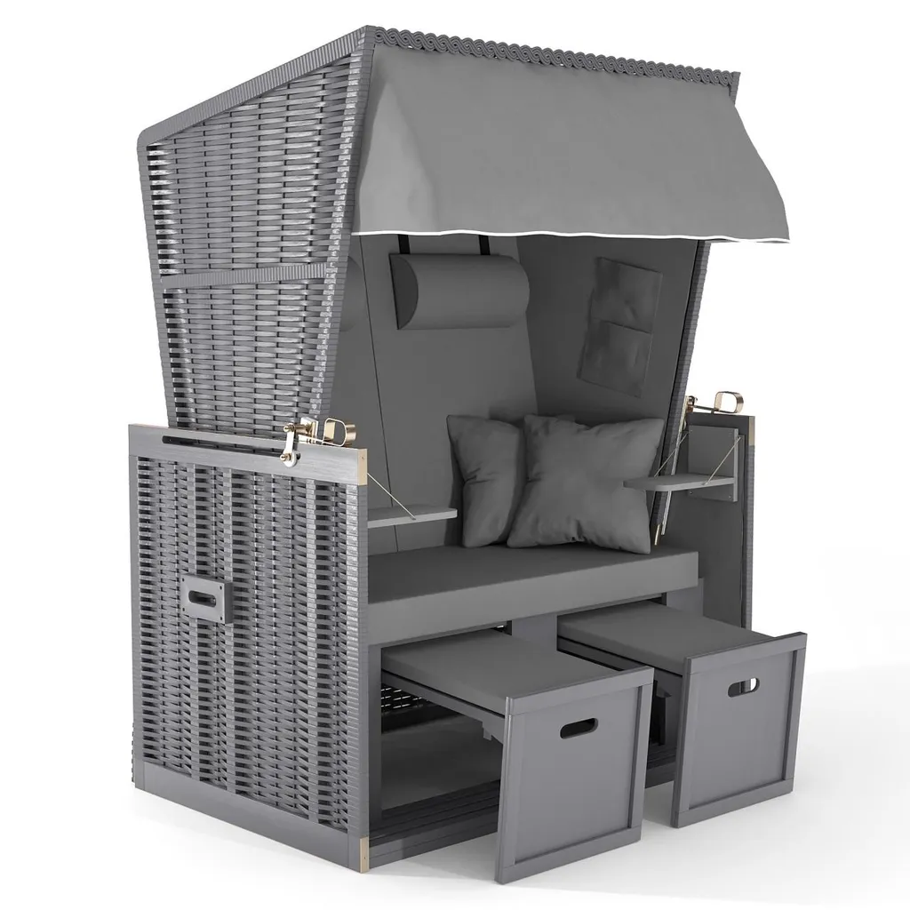Sanzaro Strandkorb XL120 cm Deluxe Zweisitzer Holz und Poly-Rattan Sylt Ostsee Volllieger inkl. 4 x Kissen klappbare Rückenlehne 2 Personen Grau Uni