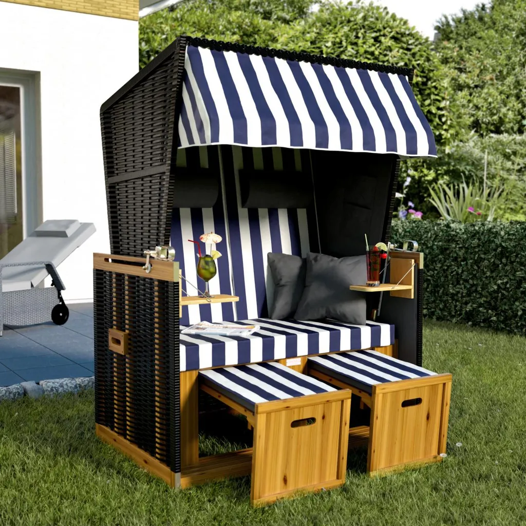 Mit diesem komfortablen Strandkorb können Sie so richtig schön relaxen und sich echtes Nord-/Ostseefeeling nach Hause holen. Der Strandkorb bietet alle Extras, die eine Wohlfühloase haben muss, und kann dank der ausziehbaren Fußstützen und des verstellbaren Oberkorbs zu einer Volliege umfunktioniert werden.