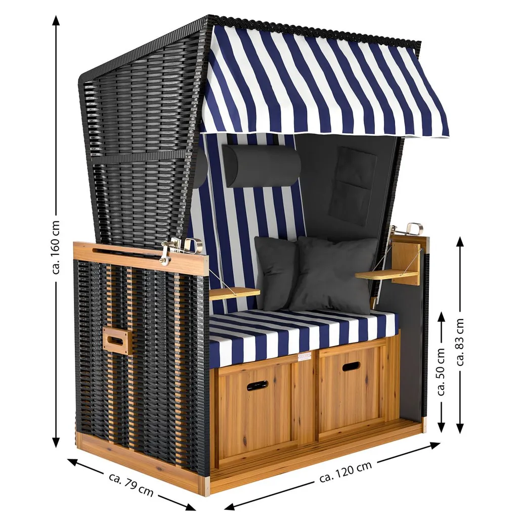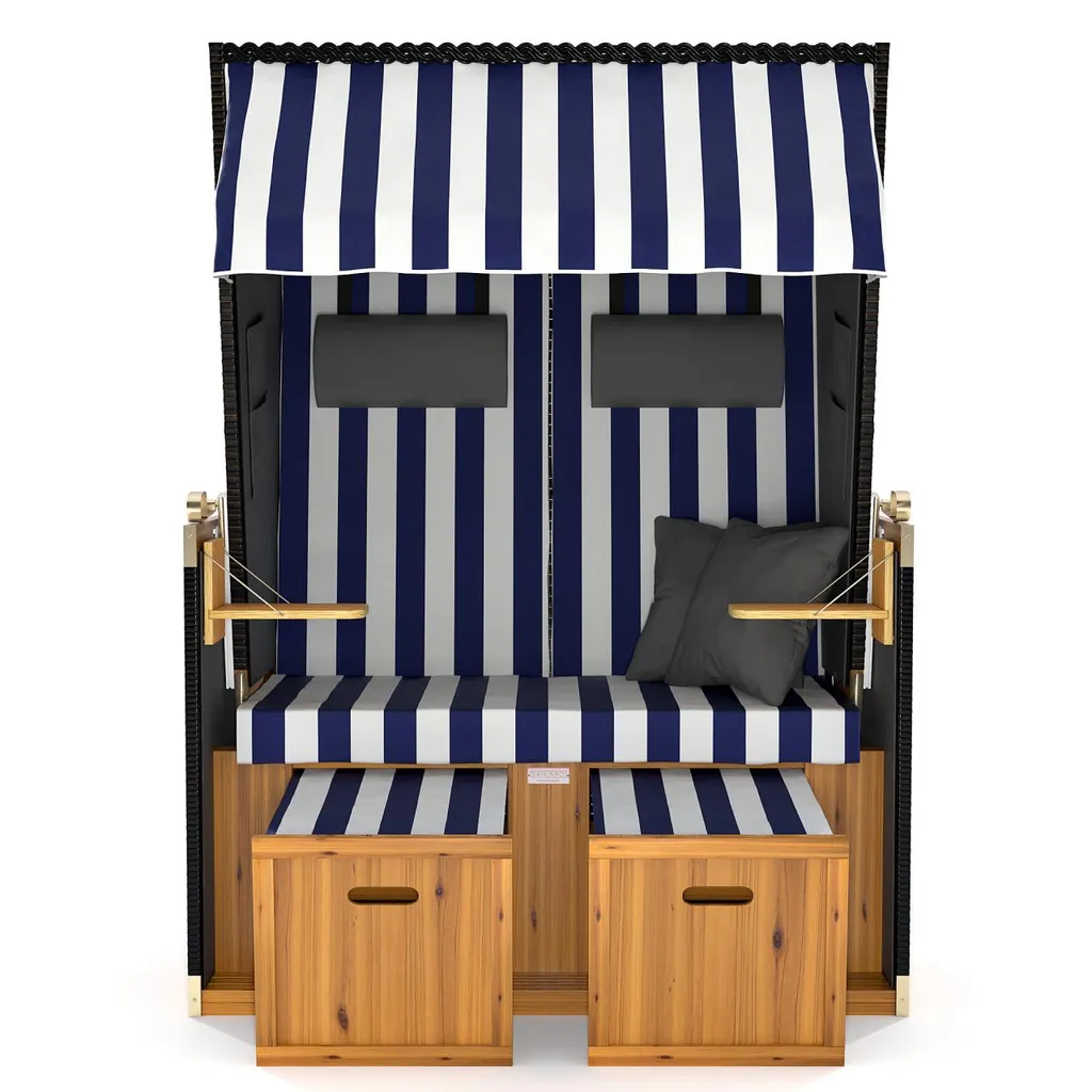 Sanzaro Strandkorb XL120 cm Deluxe Zweisitzer Holz und Poly-Rattan Volllieger 4 x Kissen klappbare Rückenlehne 2 Personen Blau-Weiss Blockstreifen
