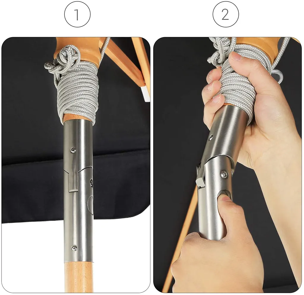 Schrauben Sie die obere Stange des Schirmmastes mit der unteren Stange zusammen, befestigen Sie den Schirmmast an einem Ständer (nicht im Lieferumfang enthalten), ziehen Sie an dem Seil, um den Schirm zu öffnen, und schon spendet der Schirm Schatten auf Ihrem Balkon!
