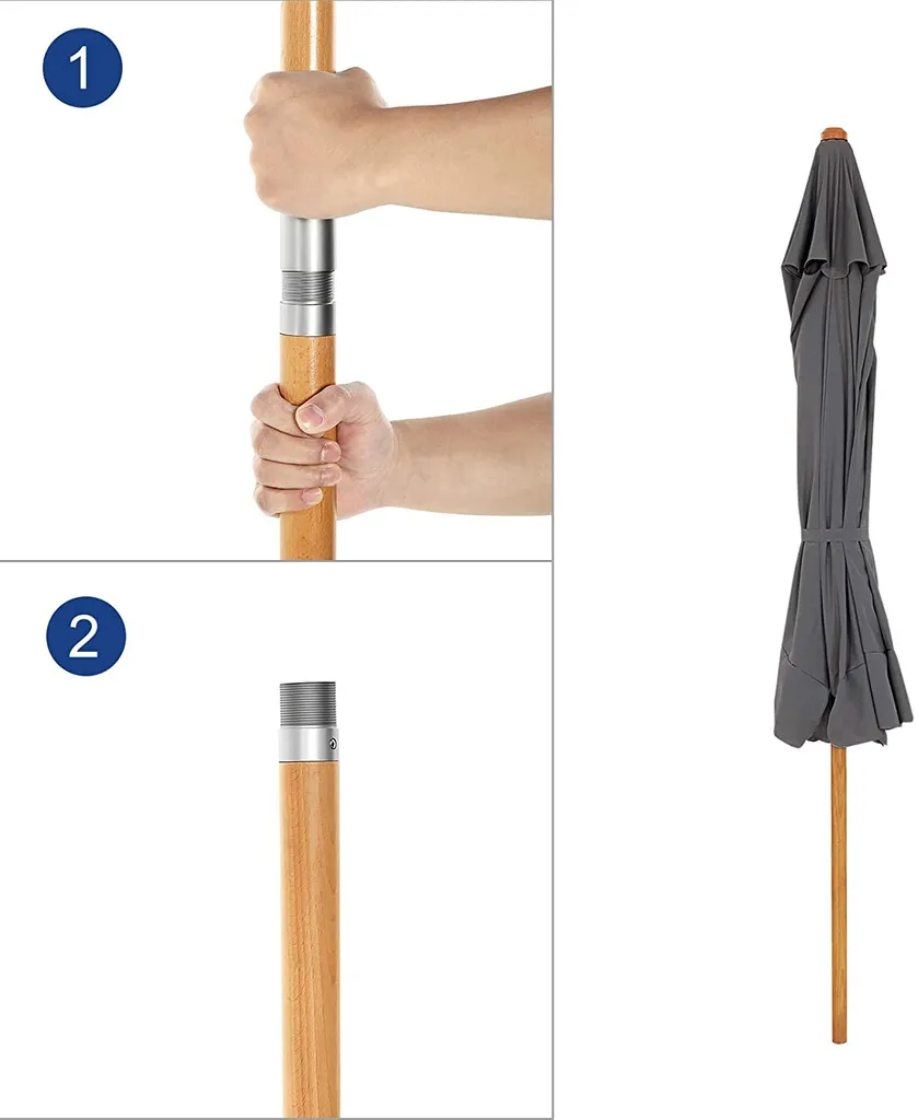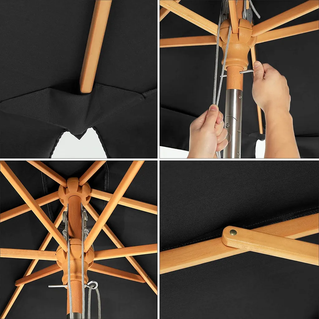 Der Schirmmast aus Buchenholz besteht aus 2 Stangen, welche durch das aus einer Aluminiumlegierung bestehende Verbindungsstück fest miteinander verbunden werden; die 6 Schirmrippen aus Hartholz geben dem Schirm zudem einen starken Halt. Die Holzmaterialien verleihen Ihrem Garten oder Balkon außerdem einen Hauch von Frische