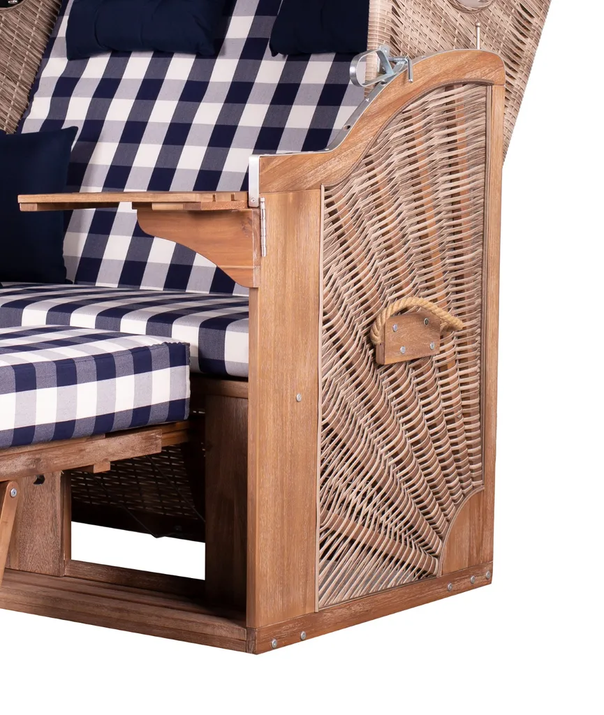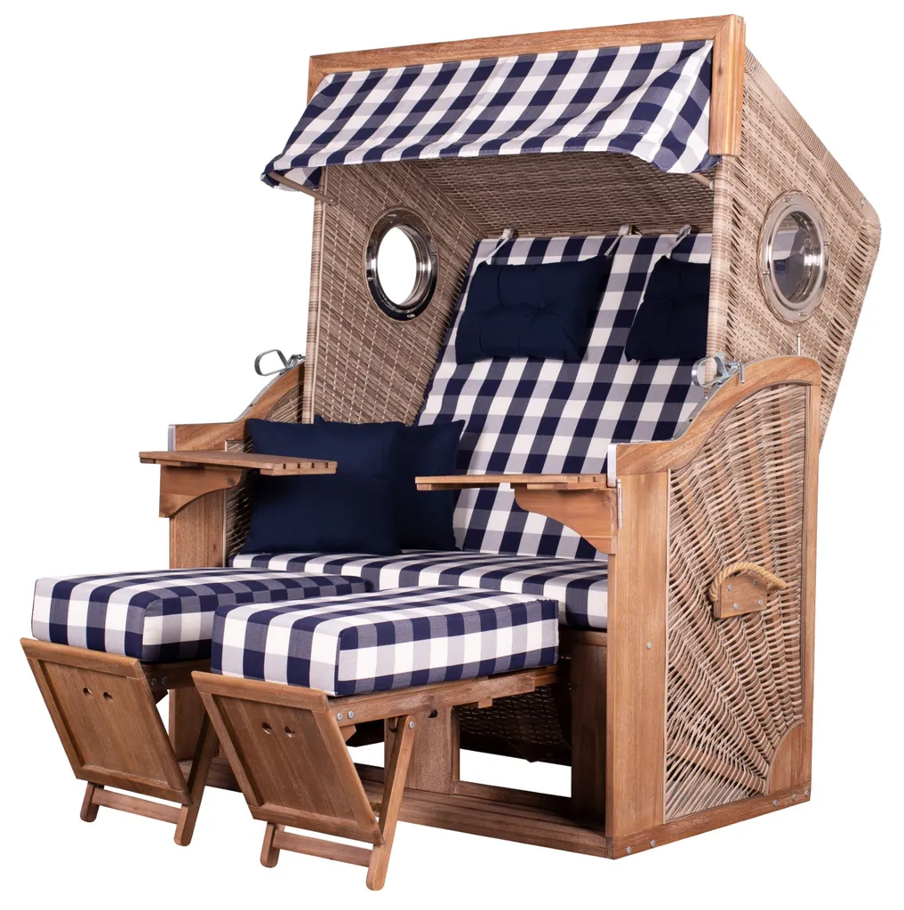 Der Strandkorb TRENDY PURE ist ein hochwertiges Outdoor-Möbelstück, welches dank der Verwendung robuster Materialien für viele Jahre Freude im Außenbereich oder im Wintergarten bereiten wird. Für Farbe sorgt die herausnehmbare Kissenausstattung mit je zwei Nacken- und Knuffelkissen im maritimen Karomuster in den Farben blau und weiß.