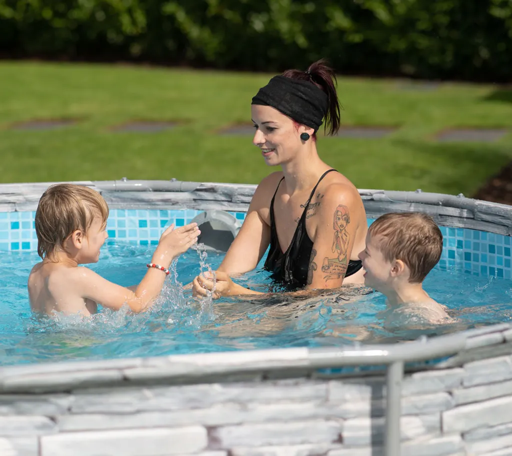 Der Pool ist schnell in Ihrem Garten aufgebaut, denn der Metallrahmen des Pools wird über das Snap-in System montiert. Durch die SkimmerPlus Filterpumpe bleibt das Wasser stetig sauber.