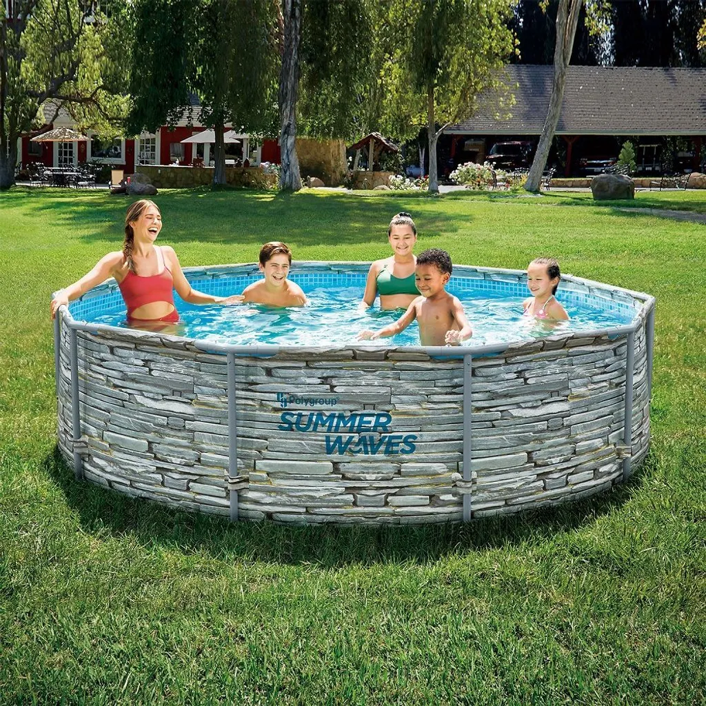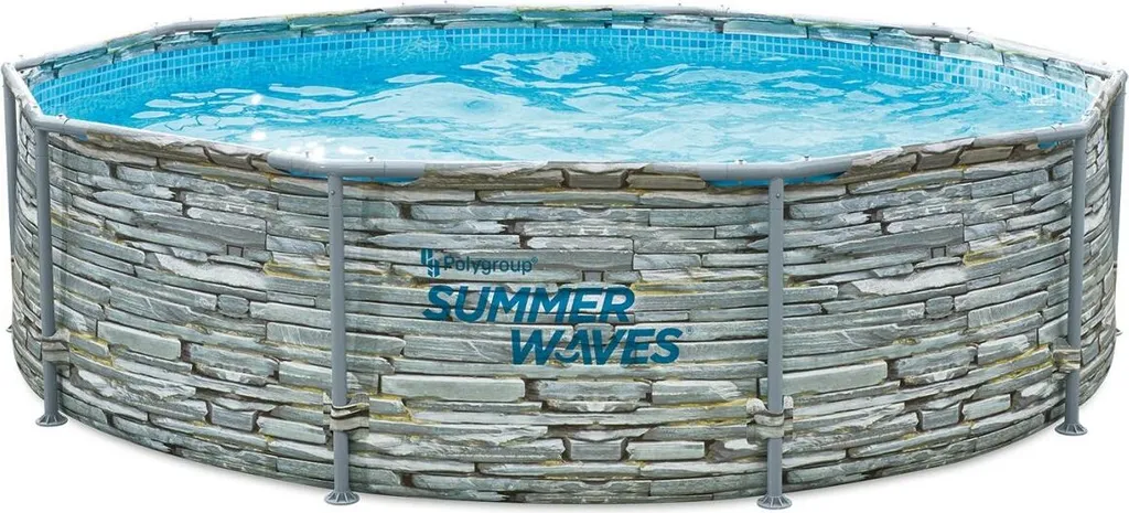 Ihr moderner und praktischer Pool für den Außenbereich!Ein eigener Pool im Garten – das ist wohl der Traum vieler Hausbesitzer. Erfüllen Sie sich jetzt diesen Traum mit dem Summer Waves Pool in natürlichanmutender Steinoptik. Der Rahmen aus pulverbeschichtetem Aluminium sorgt für besonders hohe Stabilität. Die Innenhülle des Pools besteht aus einer reißfesten Polyesterfolie, welche dem Pool zusätzliche Widerstandsfähigkeit verleiht. So ist der unbeschwerte, ausgiebige Poolspaß für die komplette Familie gesichert.Durch die individuelle, in Naturtönen gehaltene Steinoptik wird der Summer Waves Steinpool zu einem optischen Highlight in jedem Garten. Gleichzeitig fügt sich der Pool ganz natürlich und stilvoll in die Gartenlandschaft ein, ohne sich in den Vordergrund zu drängen.Im Lieferumfang enthalten ist zudem eine leistungsstarke Filteranlage samt Filterkartusche. Die einfache Schritt-für-Schritt-Anleitung ermöglicht einen unkomplizierten und schnellen Aufbau.Maße: Ø 305 x76