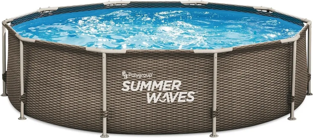 Dieser Summer Waves Pool Elite Frame 305 x 76 cm im Design " Dunkles Doppel-Rattan" ist eine schö ne Ergä nzung fü r jeden Garten. Die Auß enseite des Active Frame Pools hat ein dunkelbraunes Rattanprint. Der Aufstellpool ist einfach und schnell aufzubauen und hat eine stabile Konstruktion. Er ist mit einer Patronenfilterpumpe ausgestattet, die fü r frisches und sauberes Wasser sorgt.