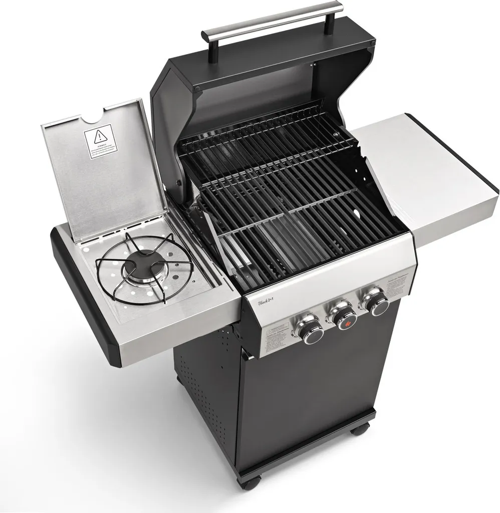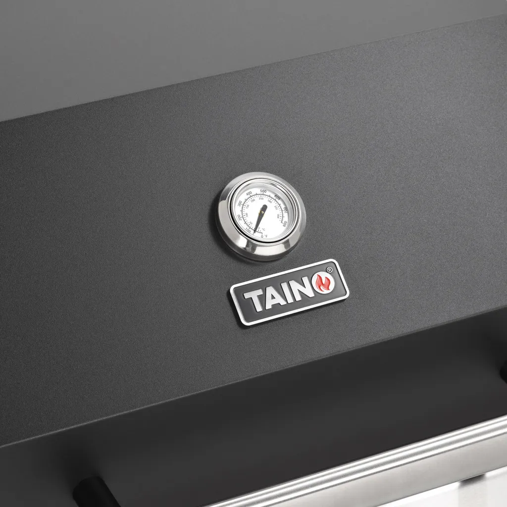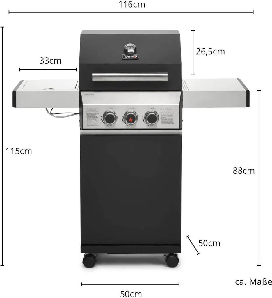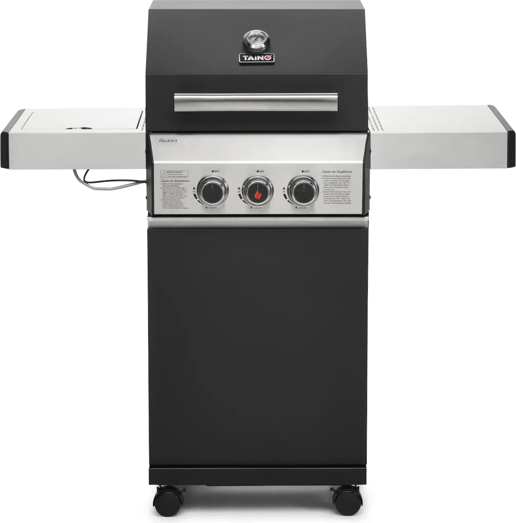 Der TAINO BLACK 2+1 Gasgrill verfügt über 2 leistungsstarke Edelstahlbrenner (je ca. 3,5 KW) und einen praktischen Seitenkocher (ca. 3 KW). Alle Brenner können mithilfe der Piezo-Zündung einzeln und stufenlos reguliert werden. Die geräumige Garkammer mit einem Grillrost aus Gusseisen ermöglicht direktes, aber auch indirektes Grillen und Garen. Der doppelwandige Deckel aus pulverbeschichtetem Stahl, mit Innenseite aus hitzebeständigem Aluminium, sorgt dank seines Materials dafür, dass die Hitze zuverlässig gespeichert wird.