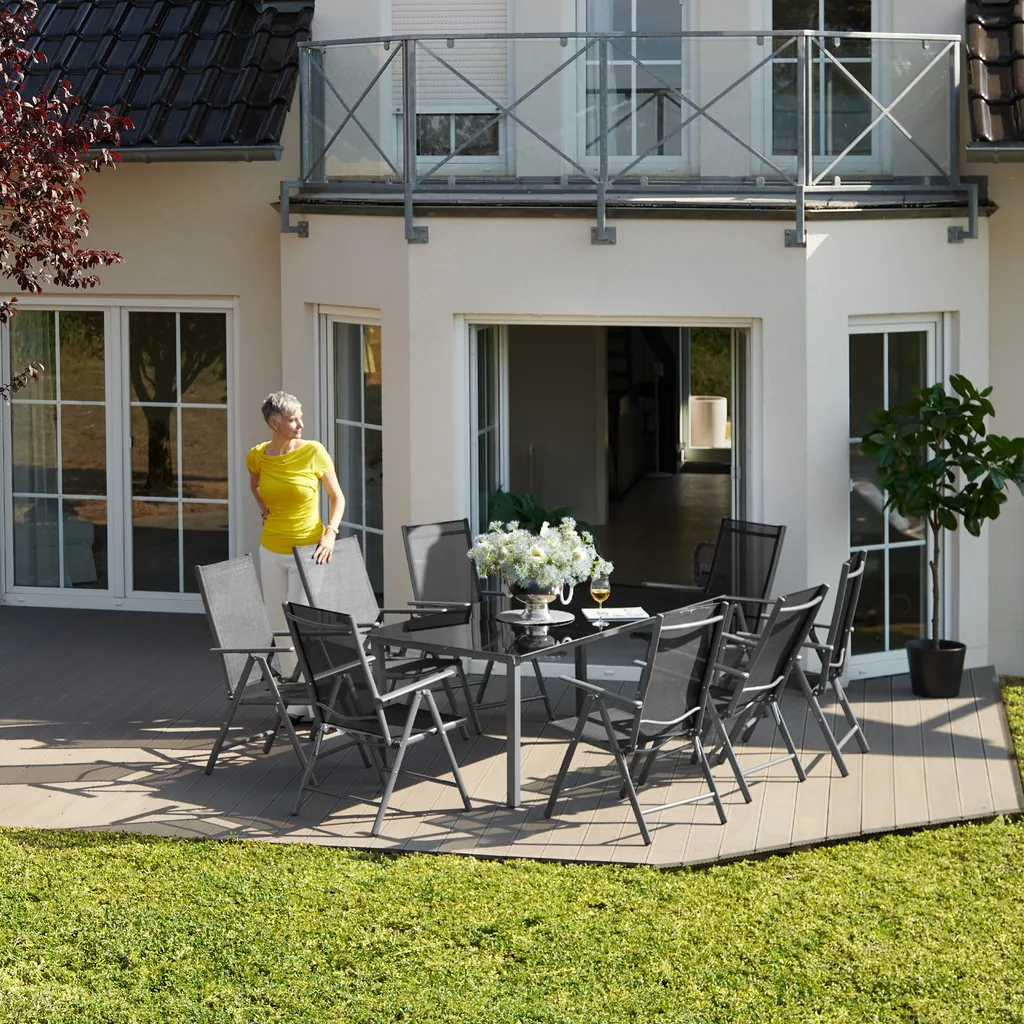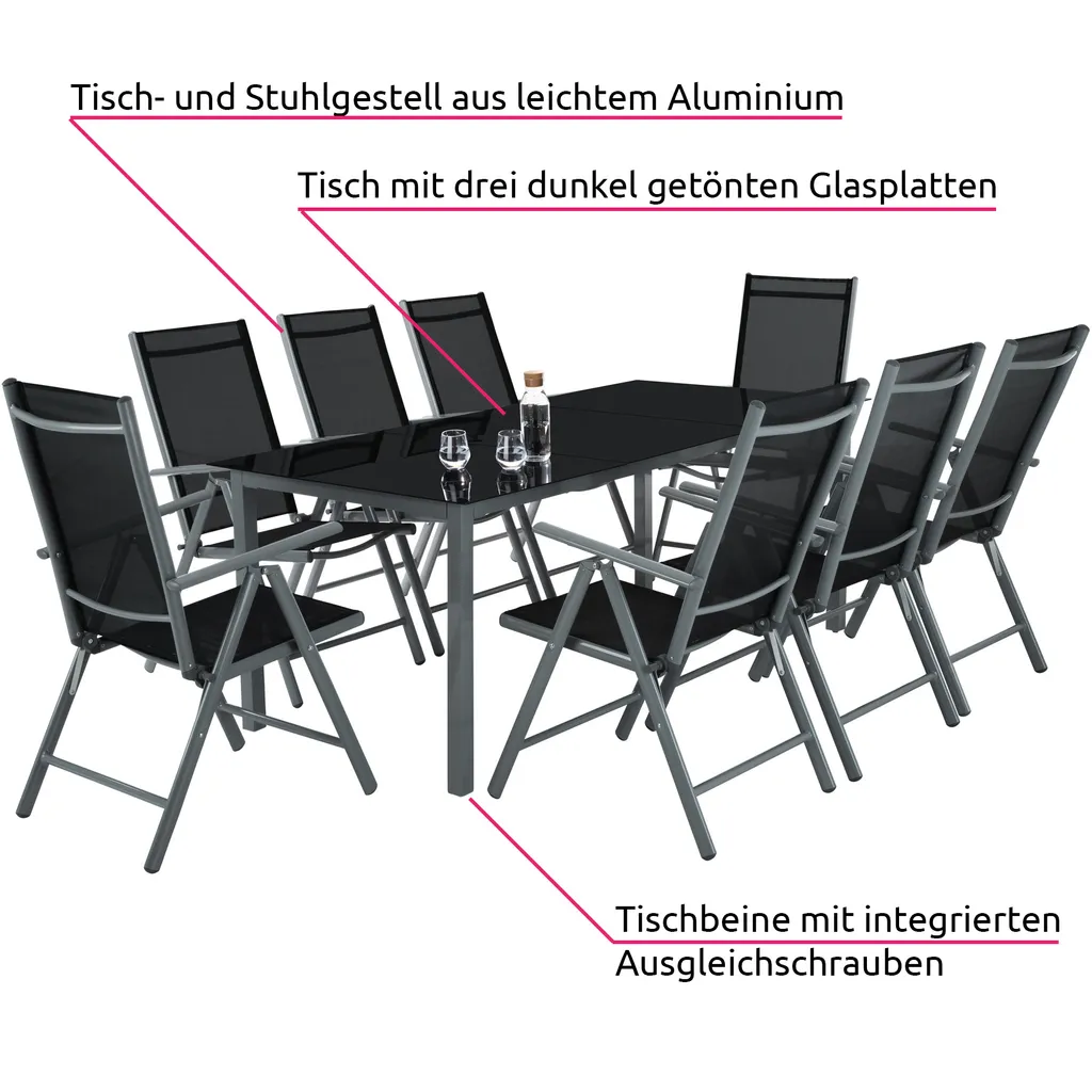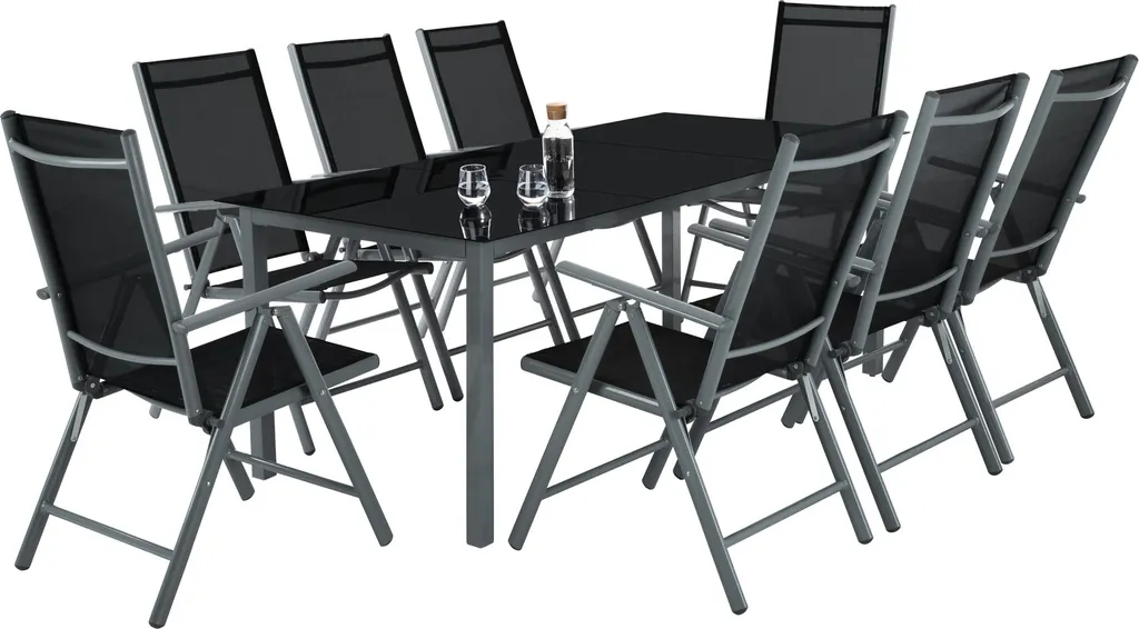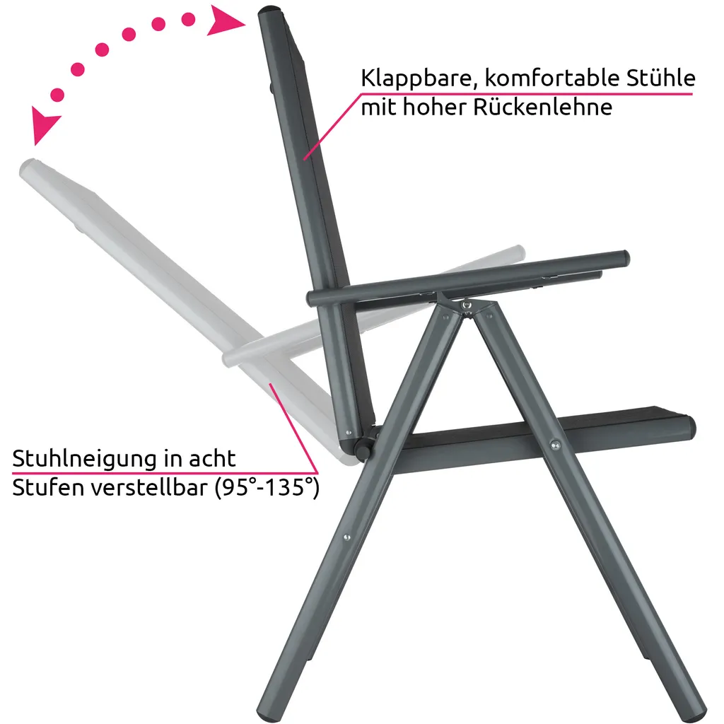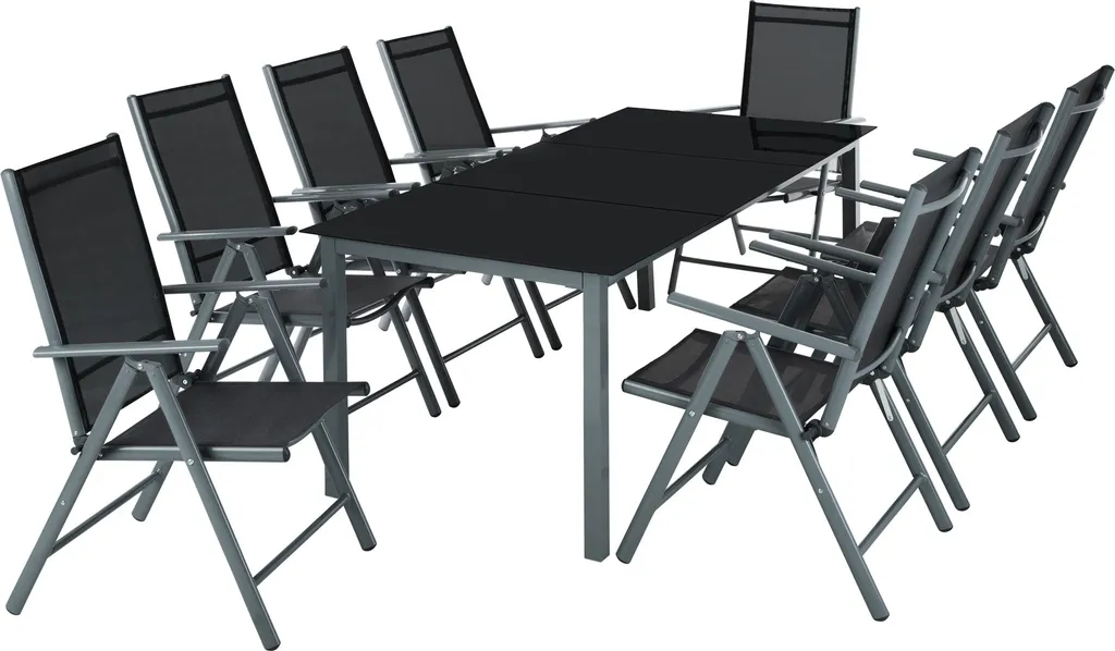 Die langlebige Aluminium Sitzgruppe besticht mit ihrem anspruchsvollen Design und intelligenter Funktionalität im Innen- und Außenbereich! Ein massiver Tisch mit ästhetischer Sicherheitsglasplatte und pulverbeschichtetem Aluminium Gestell, bietet Dir besten Komfort und Platz für viele Gäste. Dazu gehören 8 neigungsverstellbare, klappbare Stühle aus stabilem, aber sehr leichtem Aluminium. Komfortables Extra: Die Stühle haben hohe Rückenlehnen für mehr Sitzkomfort. Praktisch: Die Stühle sind klappbar und in wenigen Minuten platzsparend verstaut. Diese Sitzgruppe sorgt für Flair und Ambiente in Deinem Heim.