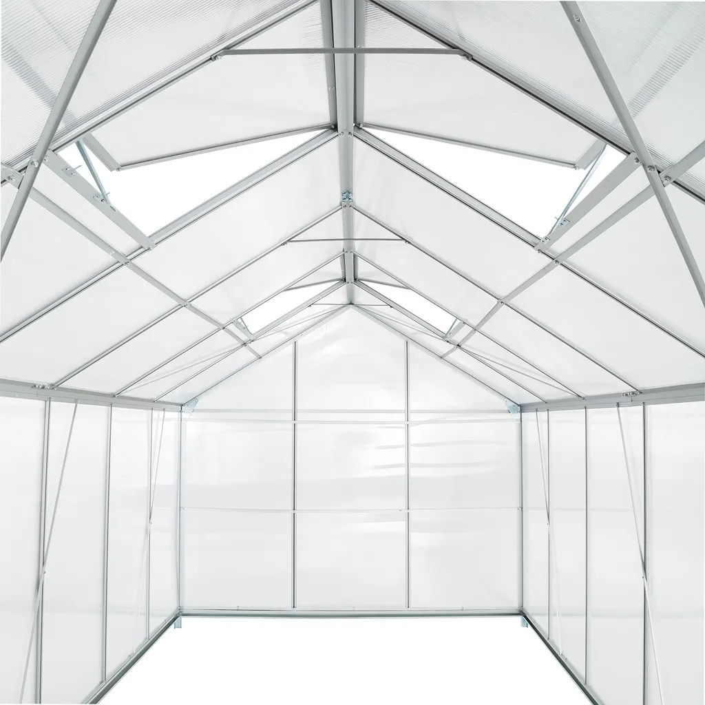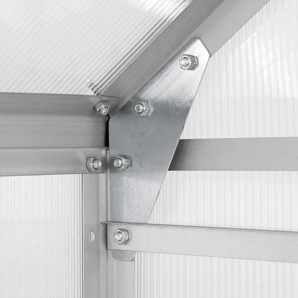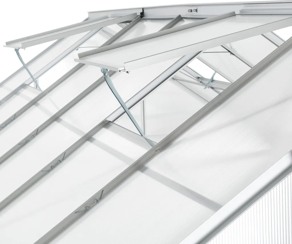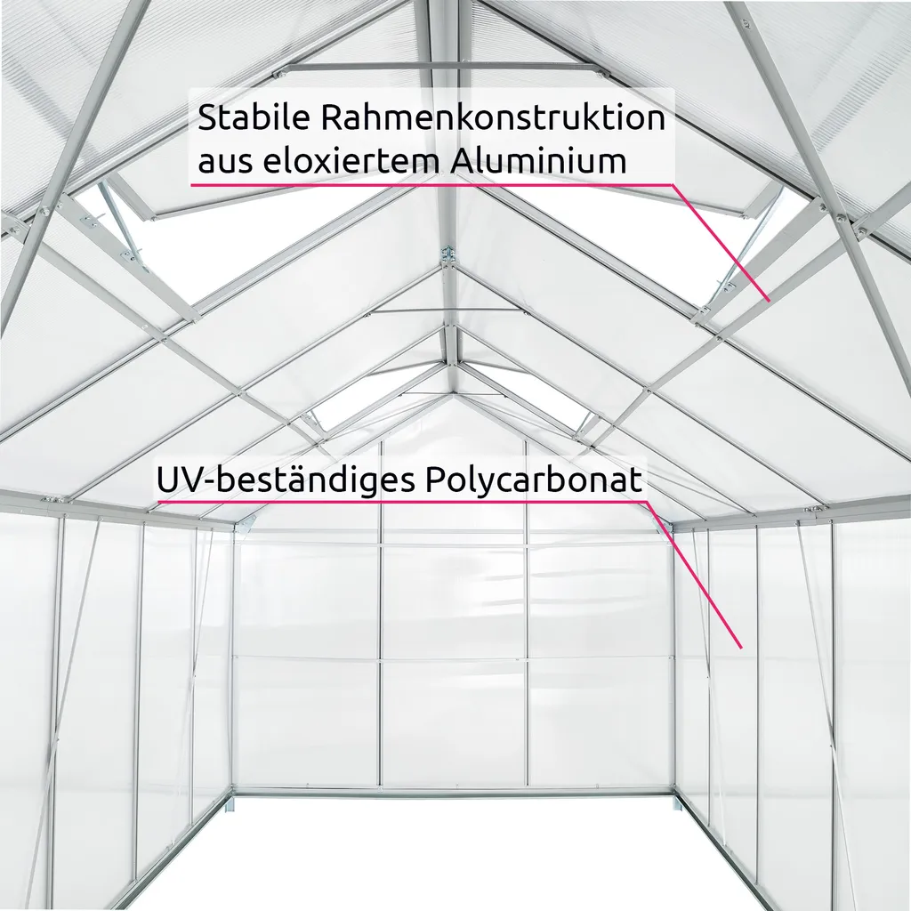 Dieses praktische Gewächshaus eignet sich hervorragend zur Aufzucht von Pflanzen in Deinem Gemüsegarten. Pflanze doch einfach Dein Gemüse, Obst und Kräuter selbst an. Durch dein eigenes Treibhaus kannst du durch die erhöhte Erwärmung und erhöhte Luftfeuchte im Innenraum sehr gute Ergebnisse beim Anbau von zum Beispiel Tomatenpflanzen erzielen. Dabei bietet unser Gartenhaus perfekten Schutz vor Wettereinflüssen wie Regen oder zu extremer Sonneneinstrahlung. Die Rahmenkonstruktion aus eloxierten Aluminiumprofilen ist stabil.