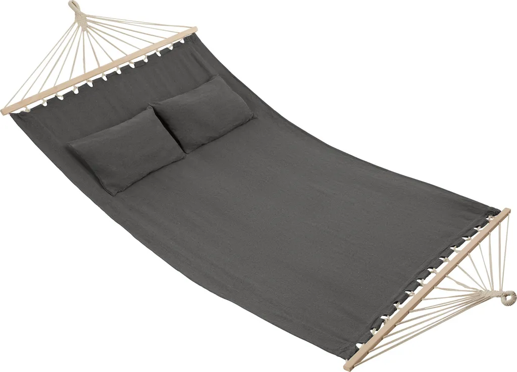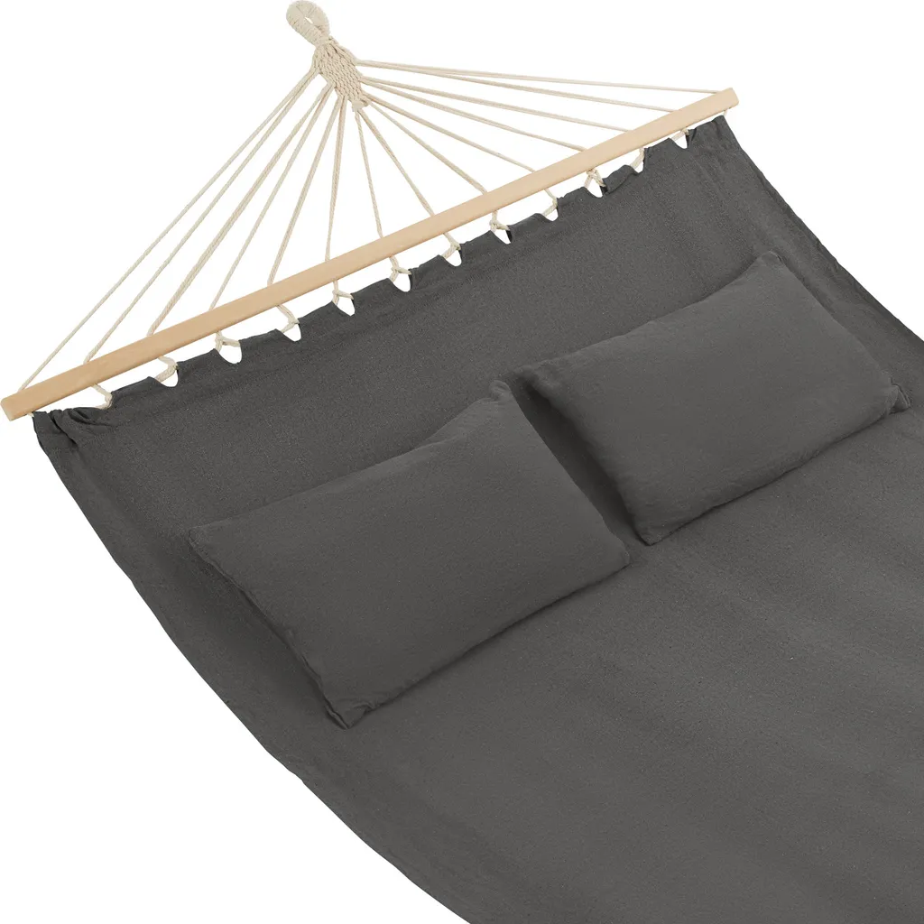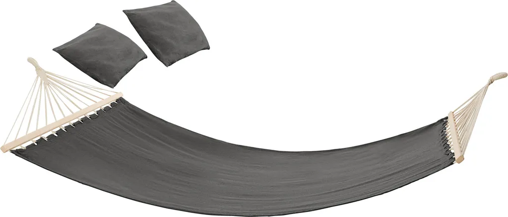 Genieße Momente voller Entspannung in der einladenden Hängematte von tectake. Eine hochwertige Mischung aus Baumwolle und Polyester macht die rückenschonende Liegefläche sowohl äußerst anschmiegsam, als auch extrem strapazierfähig. Die Spreizstäbe aus Birkenholz am unteren und oberen Ende halten das Tuch unter Spannung und ermöglichen so einen leichten Ein- und Ausstieg. Dank dem großzügigen Platz und den beiden weichen Kissen lässt es sich in der gemütlichen Mehrpersonen-Hängematte auch ganz bequem zu zweit einkuscheln.