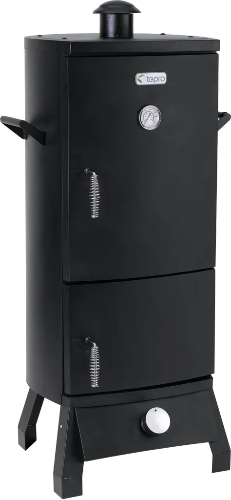 Dieser schwarze Tepro 3182 Räucherofen verfügt über einen Edelstahl-Brenner und drei verchromte Grillroste. Er ist mit einer zweigeteilten, pulverbeschichteten Tür mit zwei Metallgriffen sowie einem Thermometer, einem doppelwandigen, pulverbeschichteten Gehäuse, einem pulverbeschichteten Frontpanel sowie vier pulverbeschichteten Beinen ausgestattet. Im Räucherfass befindet sich ein Aufhängehaken. Der Ofen wird inklusive Aromaschale, Wasser- bzw. Fettauffangschale, Schlauch und Regler geliefert. Er verfügt darüber hinaus über einen Kaminabzug, zwei Tragegriffe und eine integrierte Piezo-Zündung im Drehregler.