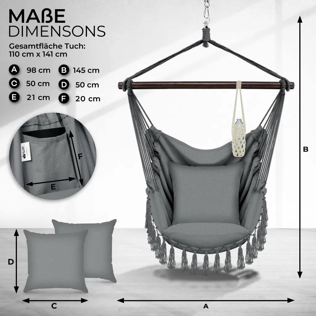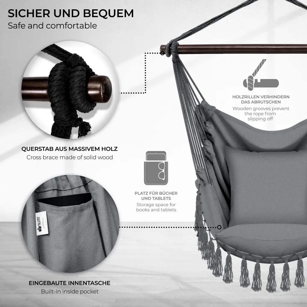 Die 2 dicken & großen XXL Kissen (50 x 50 cm), sind herausnehmbar und passen sich farblich dem Hängestuhl an.Besonders hohe Sicherheit besitzt die tillvex Hängematte durch die extrem robuste Querstange aus Massivholz (150 kg Tragkraft).