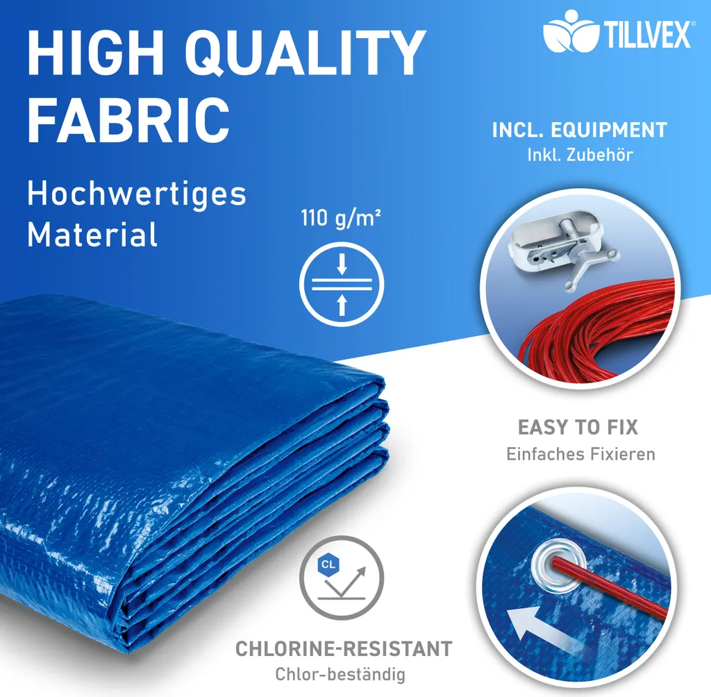 Die tillvex Poolabdeckplane schützt Ihren Pool vor Schmutz und Insekten. Zusätzlich entstehen weniger Verdunstungsverluste im Swimmingpool.
