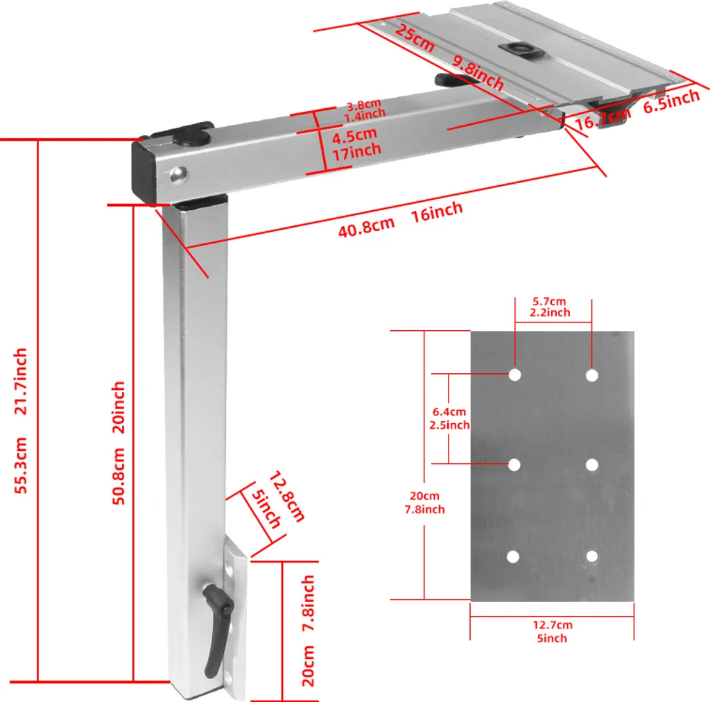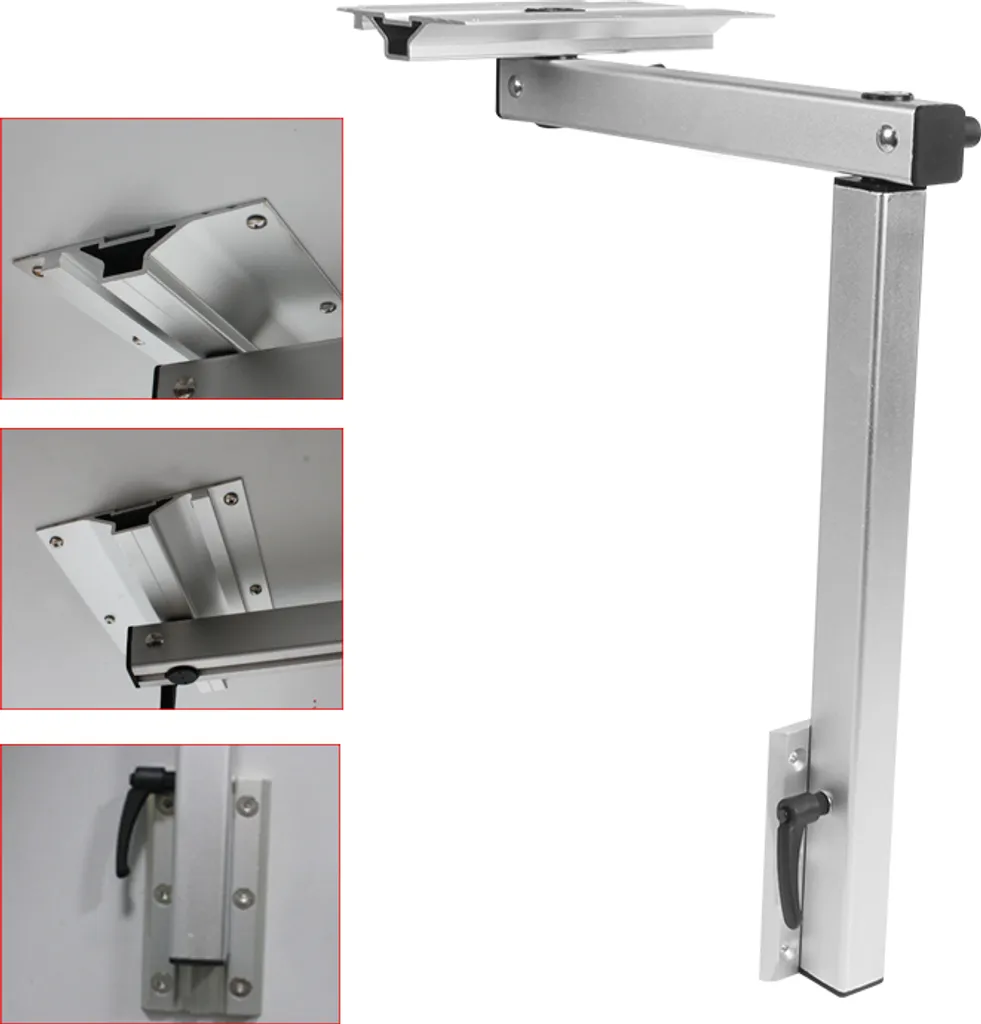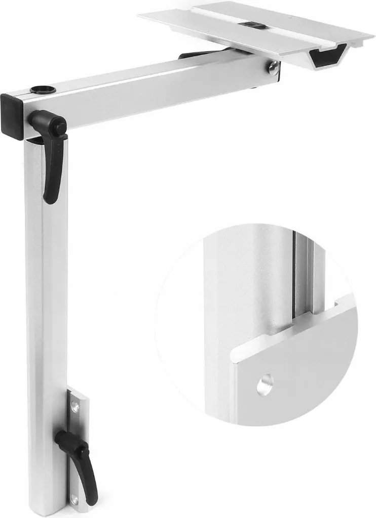 Die einstell- und schwenkbare Tischplattenhalterung ist aus einer Aluminiumlegierung produziert und somit korrosions- und oxidationsbeständig, leicht und langlebig.