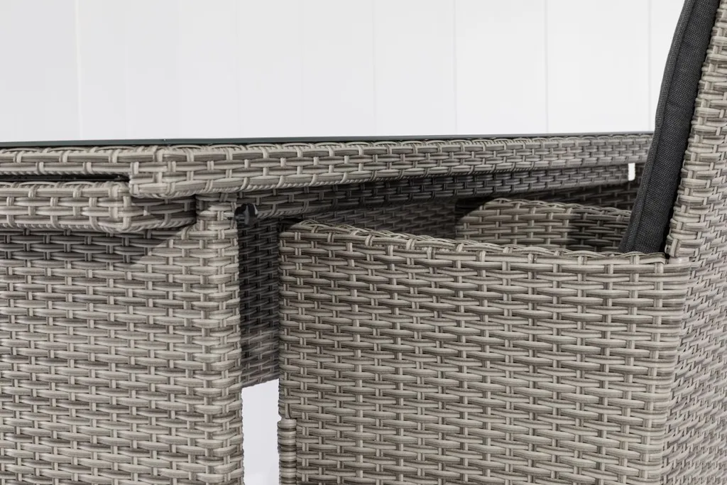 Das komfortable Esstisch-Set Lyon ist genau das Richtige für Sie, wenn Sie gerne mit der Familie und Freunden unter freiem Himmel speisen. Mühelos können Sie den Tisch mit aufliegender Strukturglasplatte in der Länge von 150 cm um zusätzliche 116,5 cm verlängern. Bequeme und farblich passende Sitz- und Rückenkissen sorgen für einen angenehmen Sitzkomfort.Das Set besteht aus:6 x Sessel: Maße je 59 x 63 cm, Höhe 100 cm, max. Belastbarkeit je 110 kg Sitzfläche 46 x 43 cm, Höhe 57 cm 2 x Hocker: Maße je 52 x 40 cm, Höhe 44 cm, max. Belastbarkeit je 110 kg 1 x Ausziehtisch: Maße 150 x 80 cm, Höhe 75 cm verlängerbar um 116,5 x 68 cm, Höhe 71 cmFarbe: atomic greyGestell: Stahlrahmenwitterungsbeständiges Kunststoffgeflechtextra hohes Rückenteilinkl. Sitz- und RückenkissenInnenmaterial Sitzkissen: 65% Polyurethan, 35% PolyesterAußenmaterial Sitzkissen: 100% PolyesterMaterial Rückenkissen: 100% PolyesterMaterial Kissen Ottomane: 100% Polyestervariable Aufstellungs-MöglichkeitenStrukturglasplatte