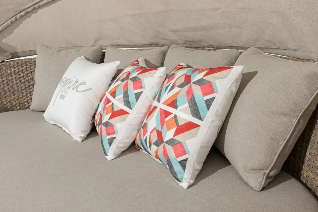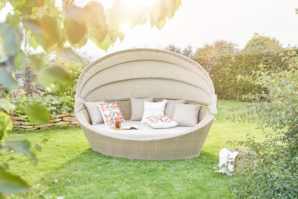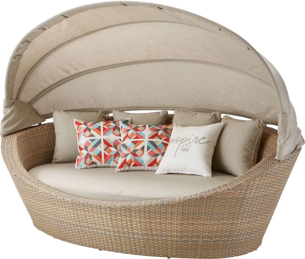Stylisch und gemütlich, das ist unser Daybed Miami mit Schattenspenderdach.Das Kunststoffgeflecht in der Farbe sand mit den passenden Sitz – und Rückenkissen in ecru und den bunten Dekokissen machen das Daybed Miami zu einem Hingucker in Ihrem Garten.Freuen Sie sich auf gemütliche Sommertage unter freiem Himmel.Farbe: sandMaße: L: 220 x 140 x H:160 cmMaterial: Aluminium-RahmenMaterial: Witterungsbeständiges Kunststoff-Geflecht, sandinkl. . Sitz und RückenkissenInnenmaterial und Außenmaterial Rückenkissen: 100 % PolyesterAußenmaterial Sitzkissen: 100 % PolyesterInnenmaterial Sitzkissen: 60% Polyurethan, 40% Polyesterinkl. ZierkissenInnen und Außenmaterial Zierkissen: 100 % Polyestermit Schattenspenderdach 100 % PolyesterBelastbarkeit Sofa: 330 kg