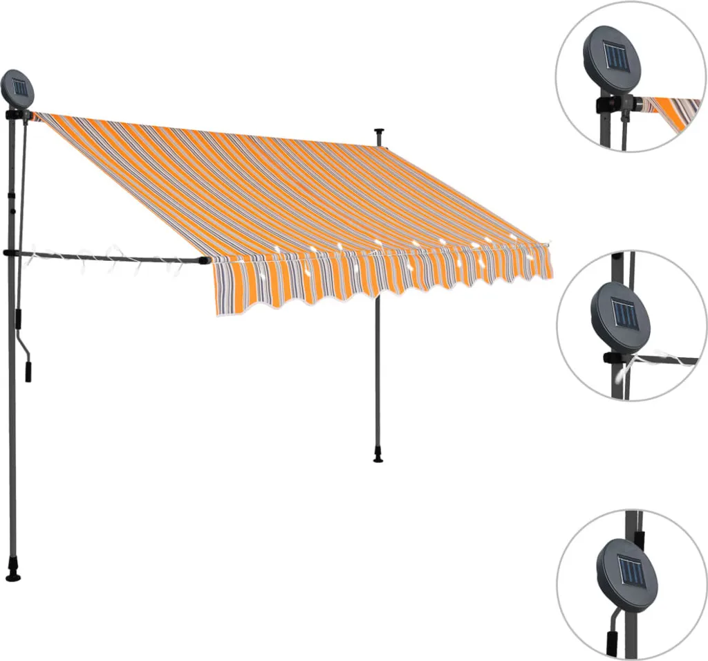Diese wasser- und schmutzabweisende sowie UV- und wetterbeständige Markise besteht aus hochwertigem Polyester mit PolyurethanBeschichtung. Der starke Stahlrahmen macht die Markise robust und langlebig. Das leicht zu reinigende Polyesterverdeck kann entfernt und gewaschen werden. Dank der Griffkurbel ist diese Markise einziehbar. Die Höhe und der Winkel der Markise können ebenfalls eingestellt werden. Darüber hinaus sorgen die solarbetriebenen LED-Leuchten nachts für energiesparende Beleuchtung. Die Markise ist leicht zu montieren.