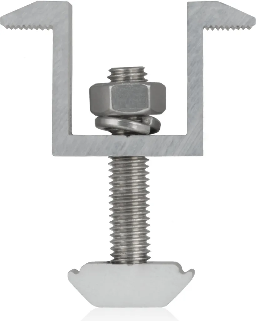Die verstellbare Klemme lässt sich durch einfaches Auf- und Zuschrauben in Ihrer Größe von 0 bis 1 cm anpassen und liegt damit immer optimal an den PV-Modulschienen an. Die Klemme ist verstellbar und somit individuell anpassbar und eignet sich für Solarschienen mit einer Breite von 2,5 cm.
